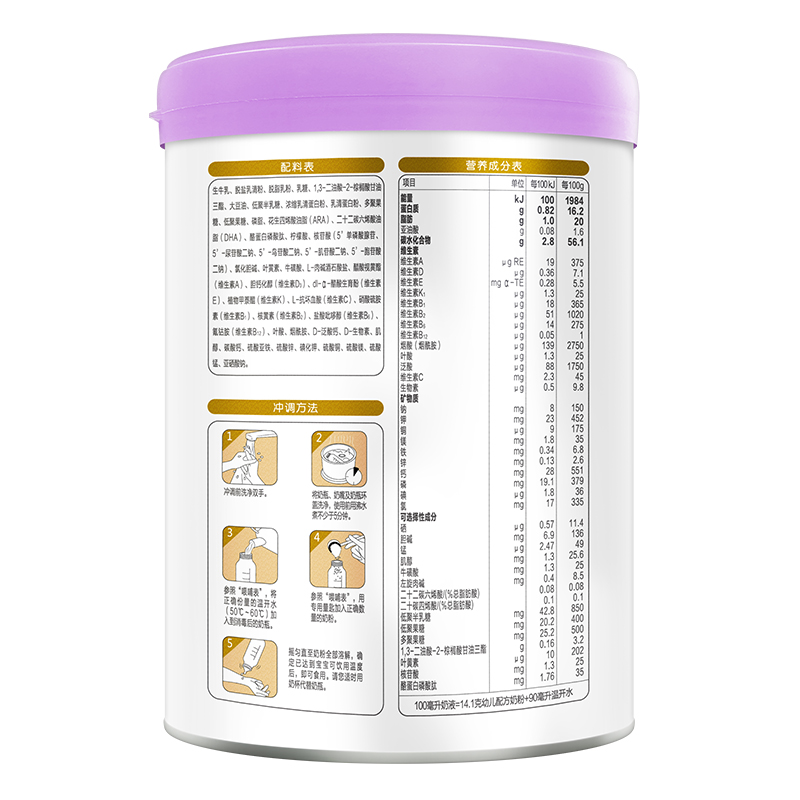 君乐宝成立于1995年,是河北省最大的乳制品加工企业,产品范围包括婴幼儿奶粉、低温酸奶、常温液态奶、牧业四大板块,其中婴幼儿奶粉在2014年正式开始生产,旗下有至臻、乐铂、恬适、乐纯、旗帜、乐臻、小小鲁班等系列,这款至臻系列主打的卖点是添加了优量的CPP(酪蛋白磷酸肽),每100g含有35mgCPP,能有效地促进人体对钙、铁、锌等微量元素的吸收和利用,有利于宝宝骨骼发育,还添加了OPO结构油脂,帮助宝宝更好的吸收和消化营养,减少便秘的发生,配方中还含有3大类营养元素,5种核苷酸促进宝宝生长发育,3重益生元呵护宝宝肠道健康,α-乳清蛋白小分子更易吸收宝宝肚肚舒服。