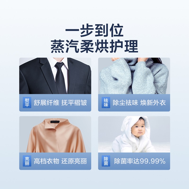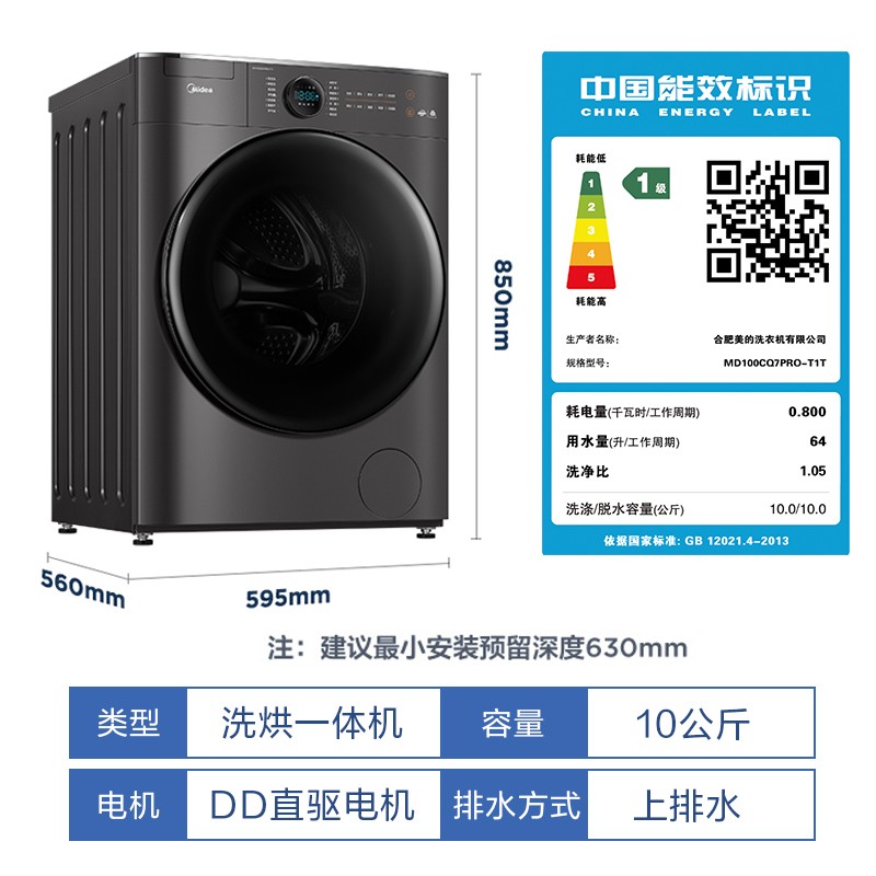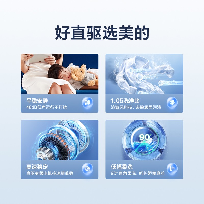 美的(Midea)这款型号为MD100CQ7PRO-T1T的洗烘一体机,洗涤容量10公斤,烘干容量7公斤,搭载有东芝设计的第五代直驱变频电机,线圈多扭矩大,控制更精准。预设有多达14种专业洗涤程序,洗净比高达1.05,其中还具备少见的90°真丝柔洗程序,呵护娇贵衣物。烘干方式为热风烘干,内置3个NTC传感器,温度湿度精装掌控。产品还支持WI-FI智控,手机APP即可实现远程操控。