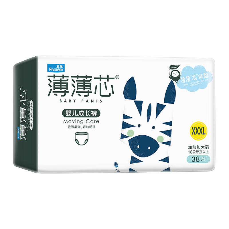 五羊始于1914年,是广州老字号品牌,2015年进军纸尿裤行业,获得多项母婴行业荣誉奖项。旗下有薄薄芯、柔柔芯、极光透气、轻奢装等系列纸尿裤。本款薄薄芯拉拉裤精选0.2cm柔薄材质,仅0.033kg/片,重量相当于一条小毛巾,减少宝宝穿戴负重感,轻薄体验更舒适,裸感宠护小屁屁。芯体采用一体成型全芯体,3D凸点面层设计,加速尿液下渗,日本进口吸水珠,不起坨不断层,牢锁尿液不下坠,吸满也轻薄。360度的弹力腰围,贴身大环腰包裹,松紧有度,轻柔贴身,让宝宝走动玩乐不拖沓,在舒适中快乐学步。