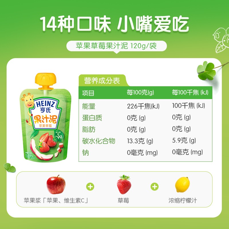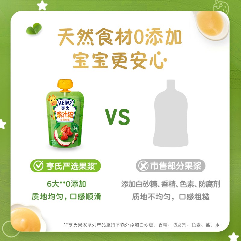 亨氏乐维滋果汁泥配方新升级,真材实料0添加,不添加香精、白砂糖、色素以及防腐剂。严格控制原料产地,运用专业的巴氏杀菌工艺,无需添加防腐剂,也能保留营养成分。为避免异物卡喉,经过了精细的硏磨,质地细腻,入口更安心。使用四层复合锁鲜膜,无防腐剂也能保鲜,品质更放心。