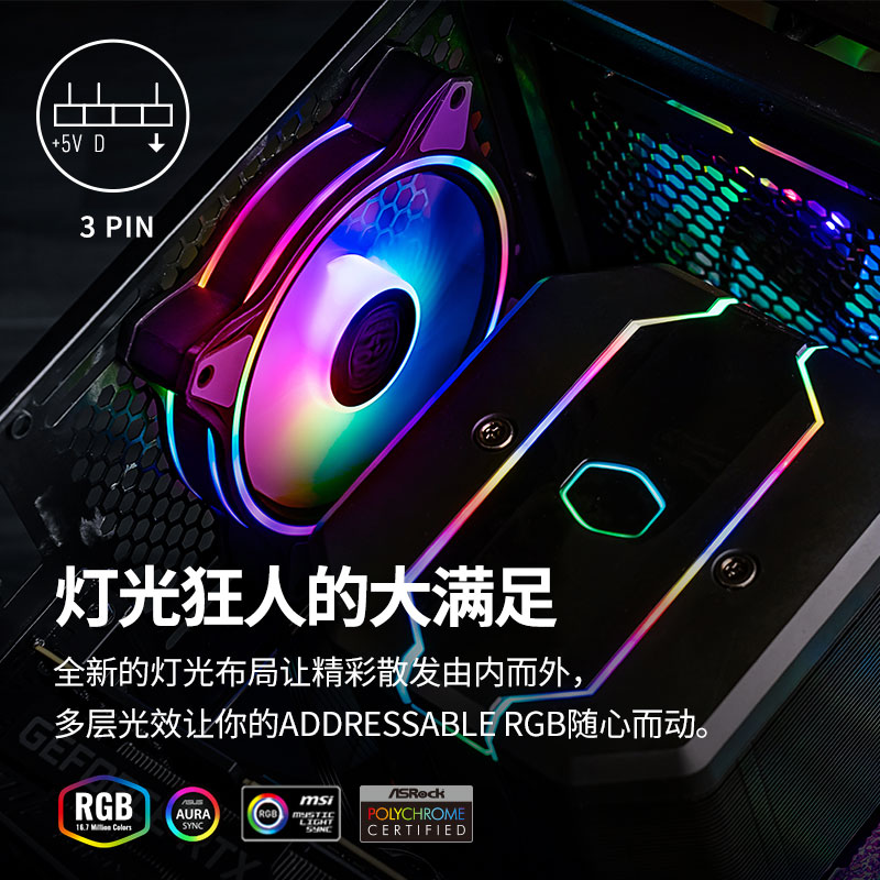 酷冷至尊MF120HALO是酷冷至尊新上市的12厘米ARGB风扇。最大亮点为整个扇面都有ARGB灯光效果的同时,正面拥有一个ARGB光圈,侧面也拥有两个ARGB光圈。其扇叶采用的乳白色的半透明材料,能让灯光更加均匀。本身是均衡型扇,转速为650-1500RPM±10%。三针ARGB接口,四针PMW风扇接口。标称最大风量47.2CFM±10%,标称风压1.60mmH2O±10%。