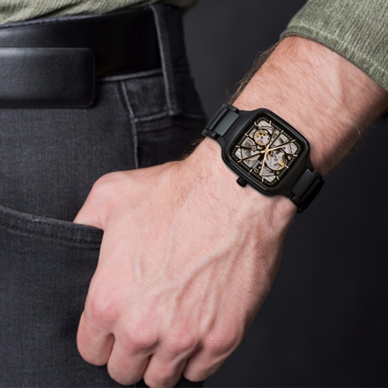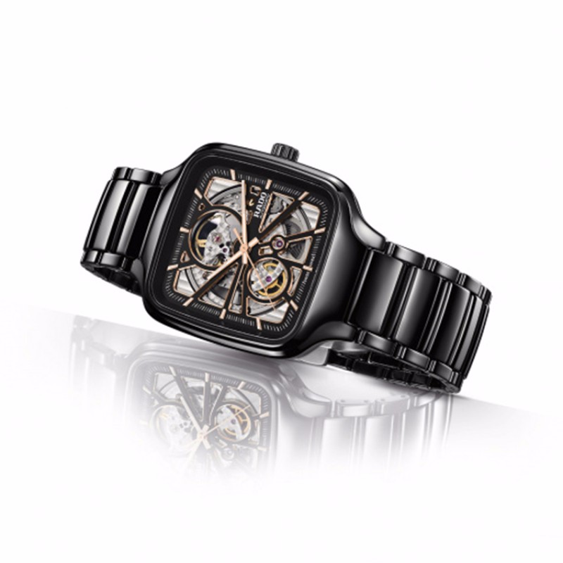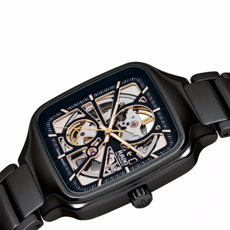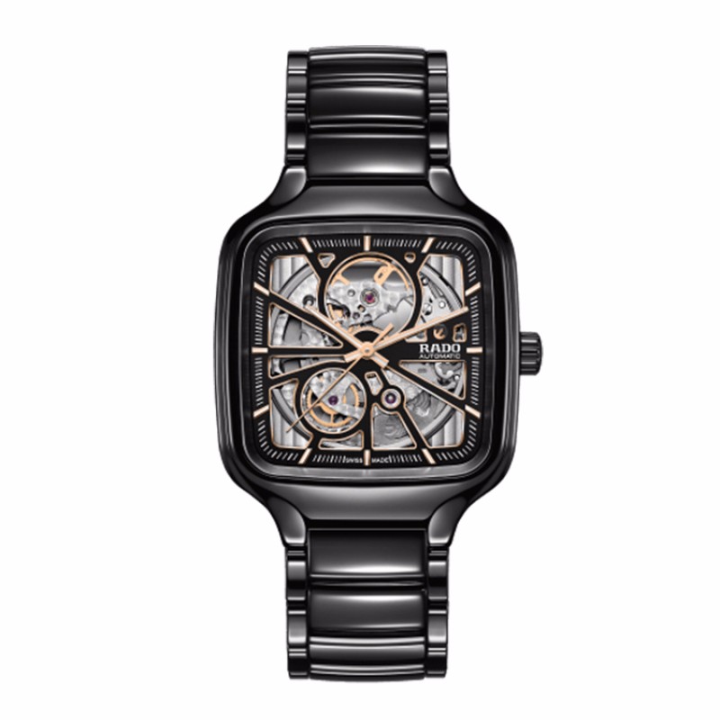 RADO 雷达 True Square真我系列 男士自动上链腕表 R27086162 38mm表径,方形一体成型,高科技陶瓷表壳的表壳,轻盈耐磨,佩戴舒适等离子色的金属光泽与玫瑰金色指针相互辉映为腕表增添迷人的魅力,镂空设计呈现出机械律动之韵,以内外修的设计充分诠释了通透之美。这款手表可达80小时动力储存,腕表无需电池提供动力,经常佩戴则无需手动上链,当动力存储耗尽时,通过手动上链可保持其运转或恢复初始动力。