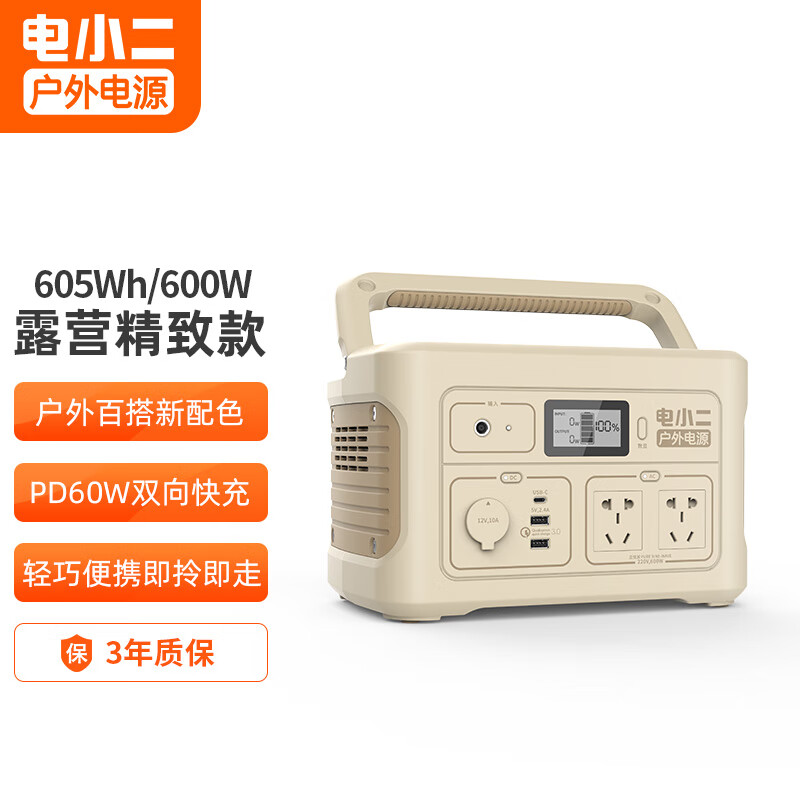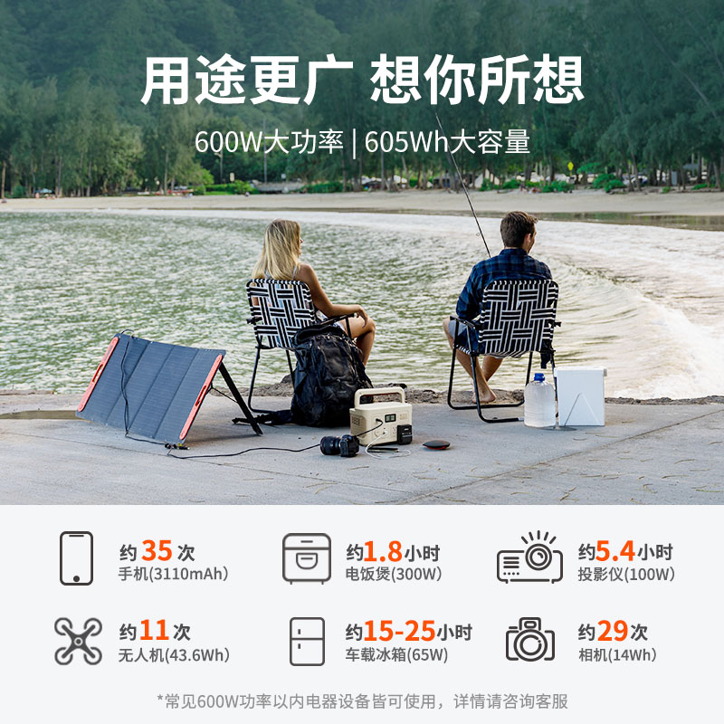 这款户外移动电源拥有605Wh大容量, 支持600W大功率,6.5kg机身便携提握,UN38.3震动测试,无惧户外颠簸;使用UL认证电芯,约1000次电芯循环,使用寿命大幅提升;通过9道专业质检,严守用电安全;6口输出,多设备同时使用,可视化显示屏,状态一目了然。
