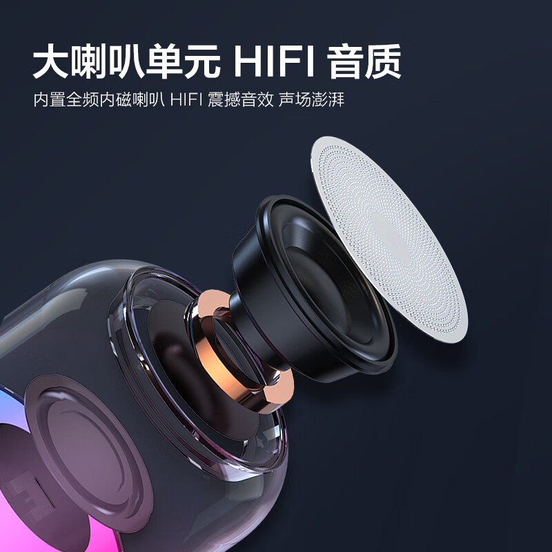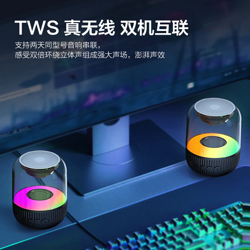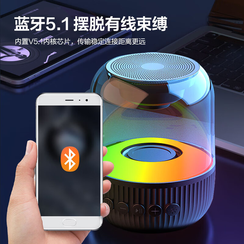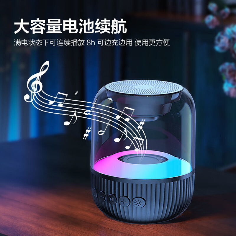 这款蓝牙音箱拥有霓虹炫彩灯效,支持一键开关灯光。内置蓝牙V5.1芯片。支持两台同型号音箱进行TWS串联,组成立体环绕声。内置全频内磁喇叭,畅听好音质。满电状态下续航约8小时。支持免提通话。支持蓝牙/TF卡/AUX播放。