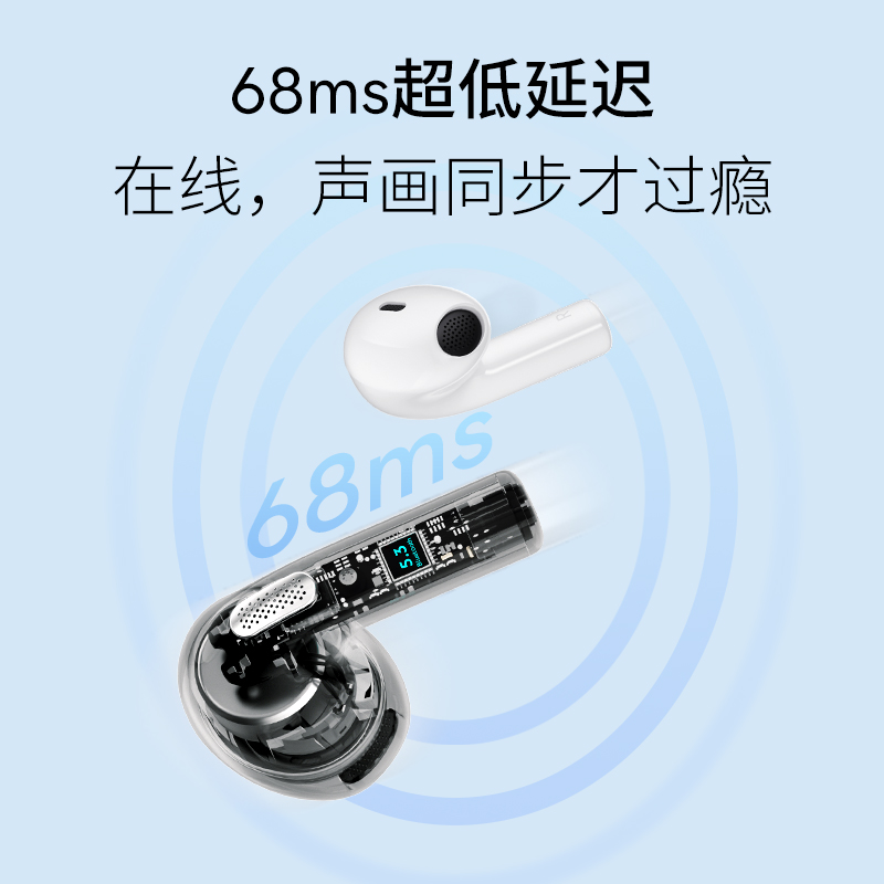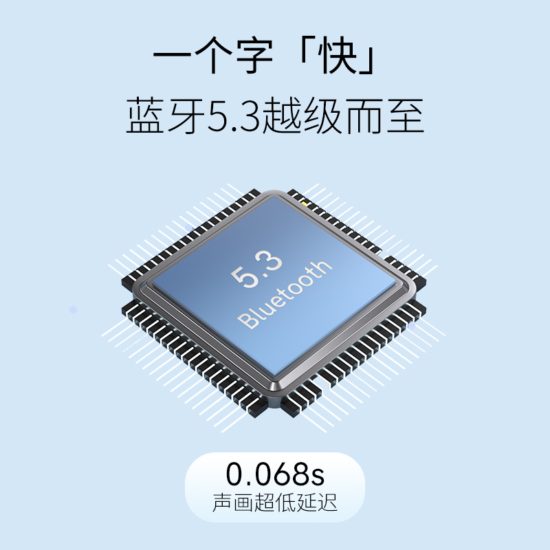 13mm高刚性LCP复合振膜喇叭,膜片表面镀钛处理,大幅提升高频解析力。新一代蓝牙5.3性能全面提升,功耗更低、 传输更快更远,从设备到耳机全链路延时低至68ms。2.6cm短柄半入耳,云感轻盈无挤压。