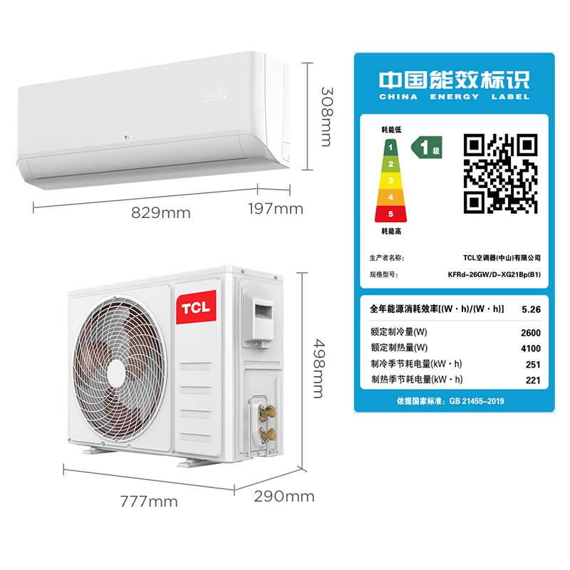 TCL这款型号为KFRd-26GW/D-XG21Bp(B1) 的壁挂式空调,制冷匹数为1匹,采用了变频压缩机,支持超高频启动,最快30秒制冷/60秒制热,最高制冷量4000W,最高制热量5380W(含1000W电辅热),APF变频能效比5.26,达到了新一级能效标准。空调采用了双层导风板,其中内部导风板采用了百孔设计,输送柔和软风,同时送风范围也更大。每小时循环风量达到了 620m3,满足10-16m㎡居室使用。