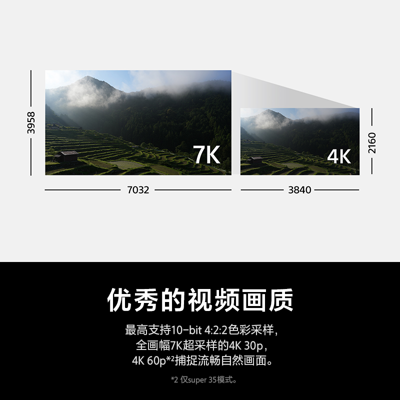 采用索尼新一代核心影像系统,约 3300 万的全画幅背照示 Exmoe R CMOS 影像传感器以及成立性能提升约 8 倍的 BIONZ XR 影像处理器。最高支持 10-bit 4:2:2 色彩采样,拥有全画幅 7K 超采样的 4K 30p、4K 60p 捕捉流畅自然画面。