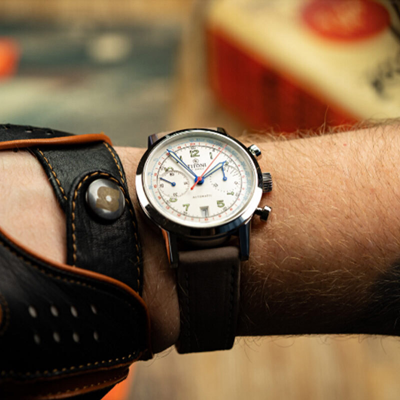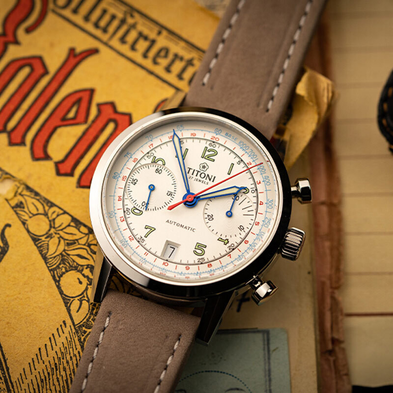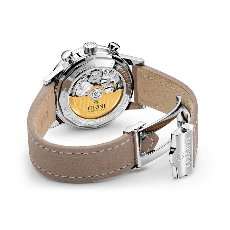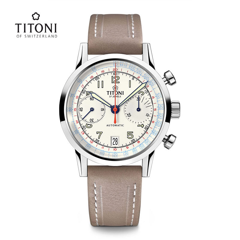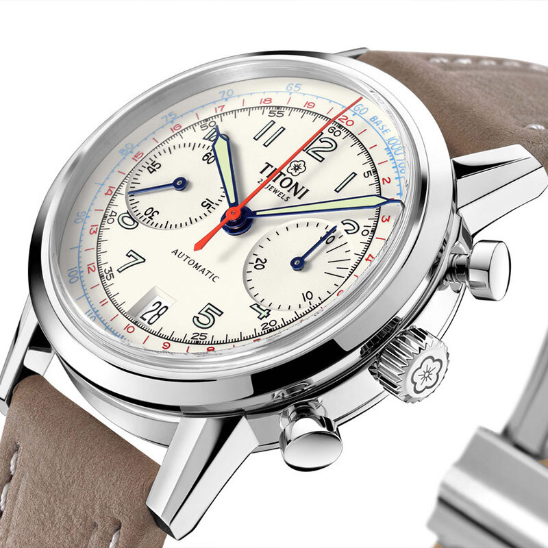 TITONI 梅花 传承系列 男士自动机械表 94019-S-ST-682,潜心雕琢的钟表工艺,锲而不舍的匠之精神,传承瑞士血统、以典雅的外观设计、高品质的取材、一丝不苟的准确性、为您打造真挚时刻,表盘装饰瑞士梅花表早年复古LOGO标志,简洁大气的蓝色宽剑针游走在白色典雅的表盘和显眼的红色时标之上,儒雅经典,计时按钮的设计也采用原版流行的样式,突出固定在表壳外把头携刻复古LOGO标志,这款手表另一个迷人的设计是透明的底盖让计时表华美精致的机芯一览无遗。