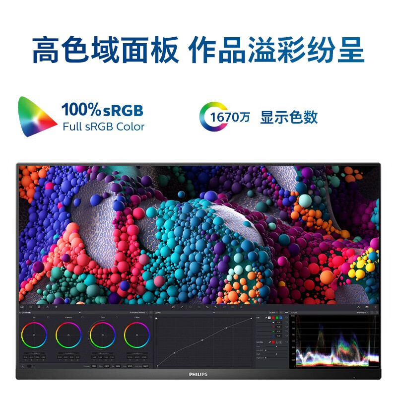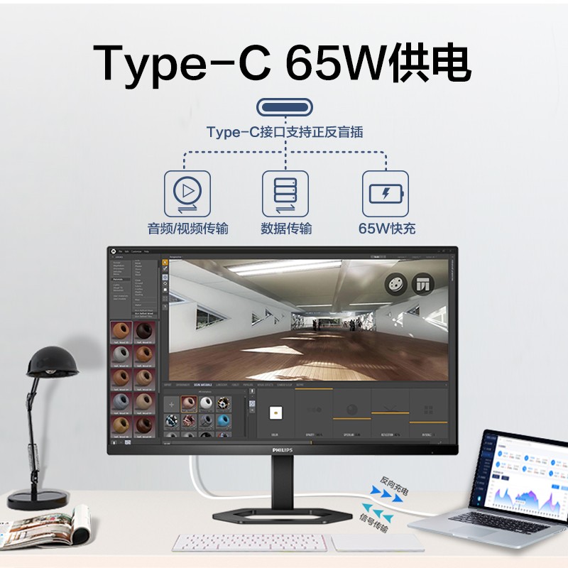 飞利浦 24E1N5600E显示器采用23.8英寸IPS面板,2560*1440分辨率,窄边框设计,75Hz刷新率,100%sRGB,99.21%NTSC广色域,1000:1对比度,1ms响应时间,178°视角,300cd/㎡亮度,支持SmartContrast技术和Adaptive Sync技术,可根据使用场景自动调节显示模式、色彩、背光亮度等。采用DC调光,滤蓝光技术有效减轻视觉压力。三边微边框设计,六边全能型底座。拥有HDMI、DP、Type-C 65W等接口。