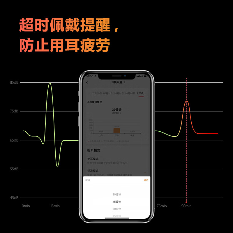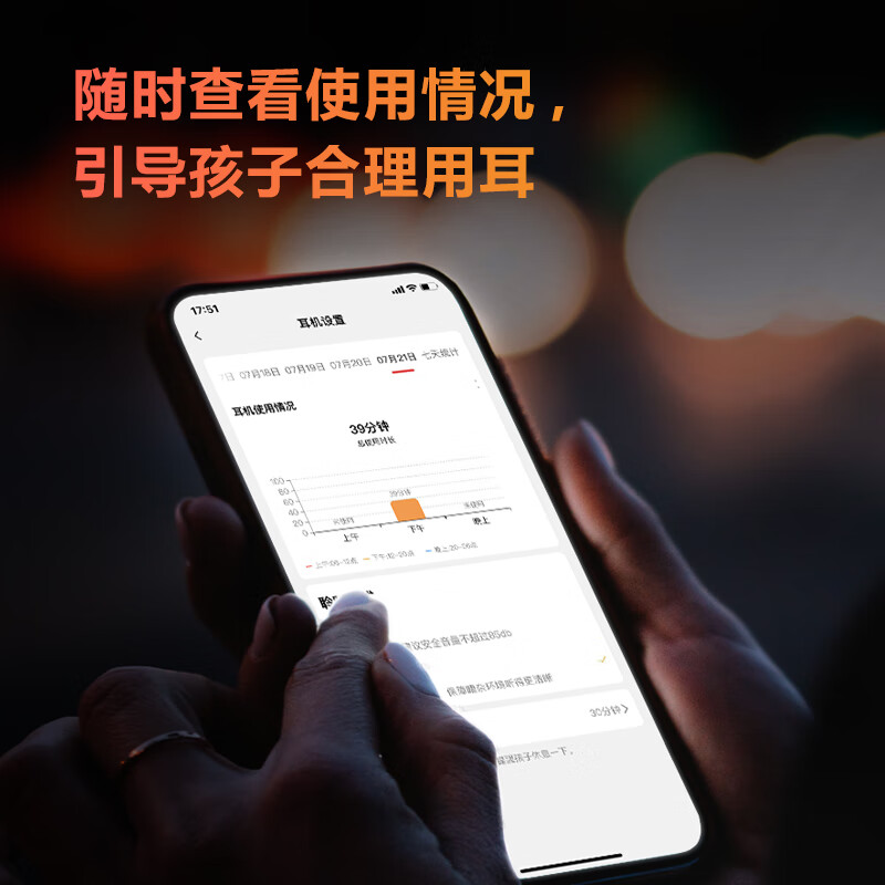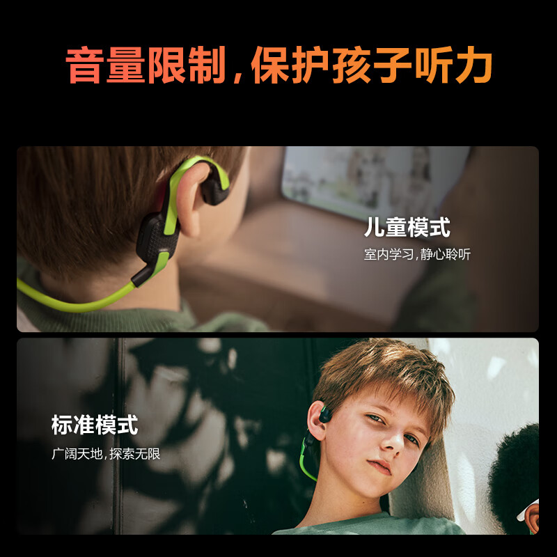 外耳佩戴,不用入耳,让耳机远离耳膜,同时保持孩子耳道干燥畅通,避免影响孩子耳道发育。独特的定向扬声专利,让声音定向传输,如一道声束,更高效地传入孩子外耳道,听得更清晰,孩子隐私有保障。世界卫生组织指出,连续听八个小时高于 85dB或听15 分钟100dB 的声音,会对听力产生损伤。为此,我们为孩子设置了两种音量模式。你可以使用家长端 APP,为孩子设置不同的音量模式,让孩子在不同场景都能随心聆听。根据世界卫生组织的建议,即使在85dB的限制下,如果听音时间过长,也会影响孩子的听力健康。在家长端 APP, 为你的孩子设置超时佩戴提醒,超过时间即刻推送提示, 防止耳朵疲劳受损。同时提醒孩子保护自己的听力,帮助孩子养成自律的好习惯。