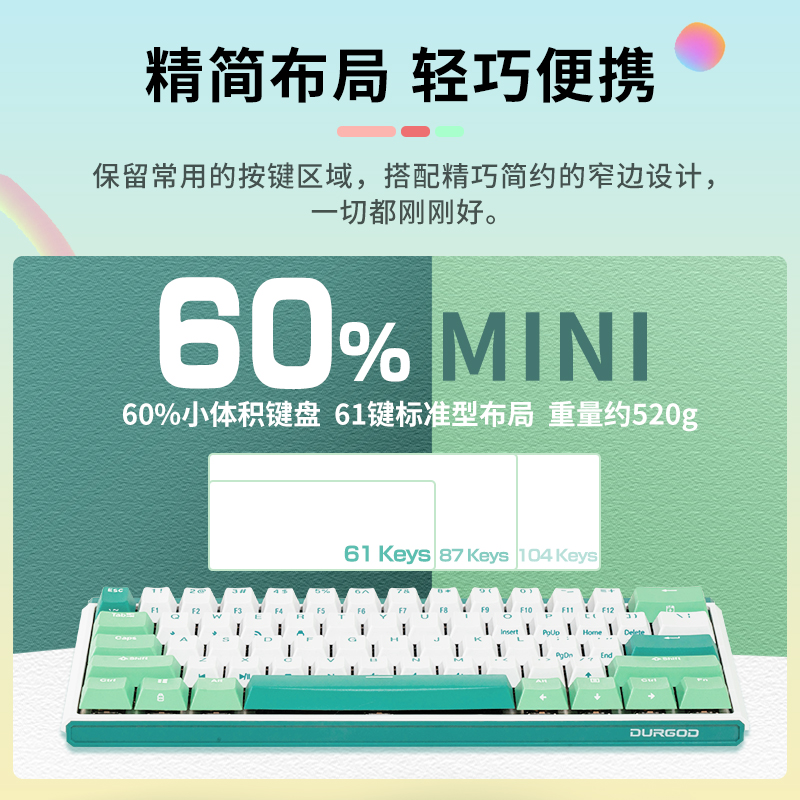 杜伽与佳达隆合作,推出定制轴体—晶轴 当键盘处于充满电并在蓝牙连接模式下使用时,超长续航约240天;当使用2.4G无线连接时,超长续航约180天。 60%小体积键盘,61键紧凑型布局,重量约520g,便于外出携带 支持蓝牙/2.4G/有线三种连接模式技术,可满足办公、游戏等不同需求 无线接收效果更强,快速响应,组队开黑无负担 丰富清新配色,四色可选