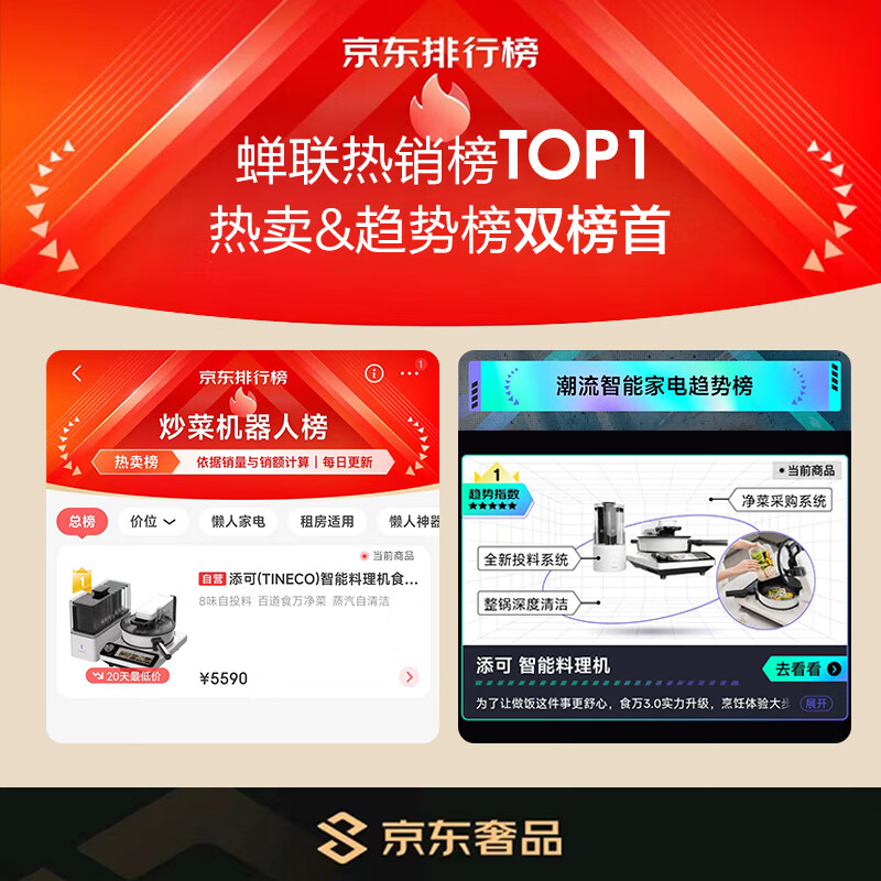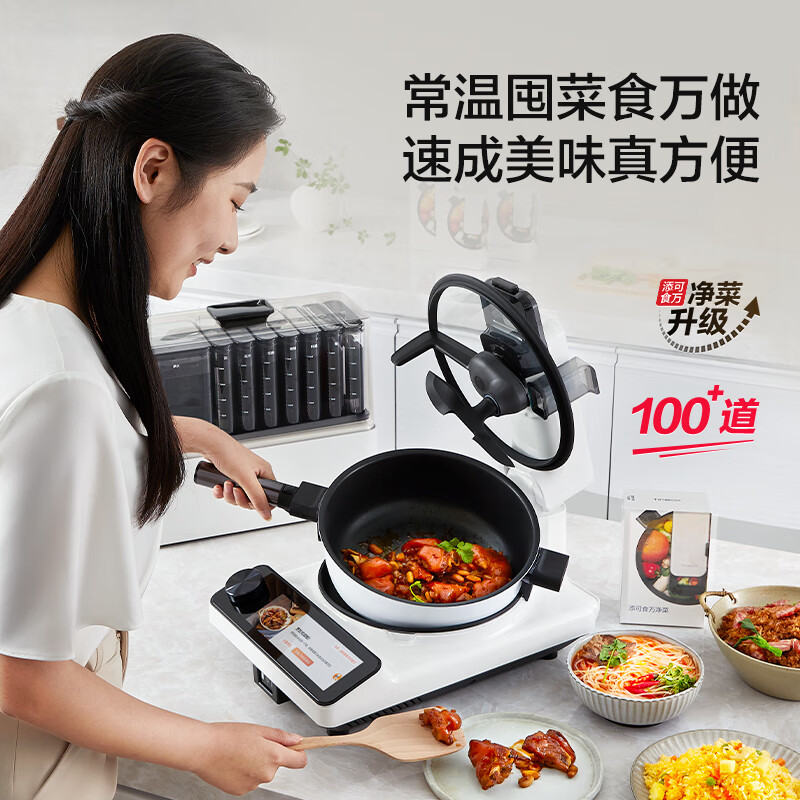 这款添可 食万3.0 智能料理机通过添可生活APP和食万3.0可实现数据互通手机配置菜谱,机器自动同步并根据预置菜谱进行自动烹饪,且机身搭载7.84英寸全彩触控屏幕和物理旋钮,更大的屏幕,更窄的边框,更圆润的转角让食万3.0的视觉和操作体验更上一层。食万3.0搭配外置“万花筒”型料盒,可存储5种基础调料根据预置菜谱智能投放调料,无需人工斟酌用量,内置整合称重系统,自动称量投入食材克重并实时计算调料用量,调控咸淡。更惊喜的是,“谁洗锅”的难题有了答案,食万3.0自清洁系统烹饪完毕开启自清洁你只需等待片刻,倾倒污水即可。添可APP内可直接下单净菜,冷链送货上门买菜、择菜、切菜……统统免了。
