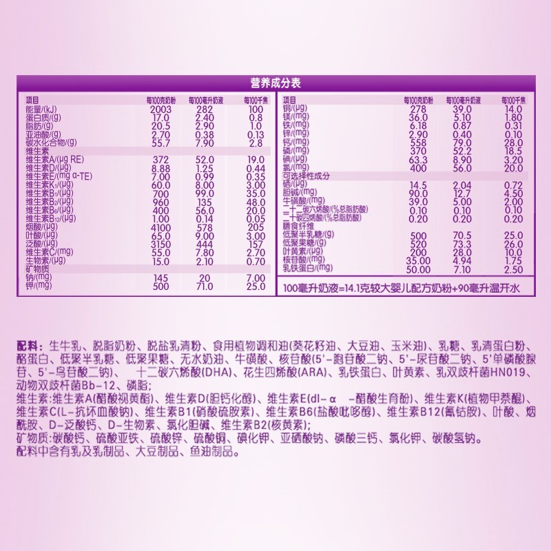 伊利是知名的国产奶粉企业,旗下的奶粉产品线比较丰富,金领冠是其人气和销量都占据前列的品牌,有金领冠睿护、珍护、菁护等系列,这款金领冠菁护主打的卖点就是富含A2蛋白,呵护宝宝肠胃,臻选1%专属农场的纯正A2奶牛,这种奶牛所产的牛奶含有A2蛋白,贴近乳源蛋白质结构,能够促进消化吸收,调节肠胃健康,配方中含有α+β蛋白组合,能够促进宝宝免疫系统的发育,让肠道更加舒适,还特别添加双重益生元,可以促进宝宝肠道健康,优量乳铁蛋白能够增加宝宝的自身保护力。