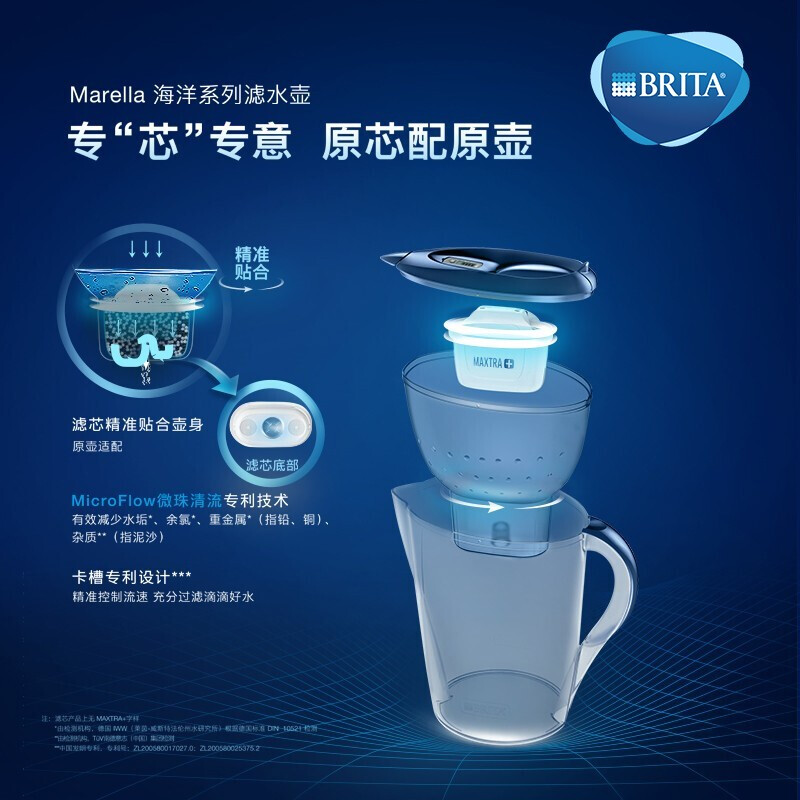 德国的Brita碧然德是过滤水系统行业的领头羊,这款Marella 金典系列滤水壶容量为3.5升,杯盖位置有滤芯更换提示屏,避免滤芯寿命到期后继续使用带来的二次污染问题。在滤芯方面,它采用新一代的BRITA MAXTRA滤芯,能过滤水中的重金属、余氯和异味,滤水量为2升,滤芯使用寿命4周/100升,适合2~3人使用。专家版滤芯从技术上进行了升级,专为中国用户制造,滤芯的去水垢能力相比普通滤芯提升50%以上,更有效减少余氯,改善水质口感,更好过滤杂质。