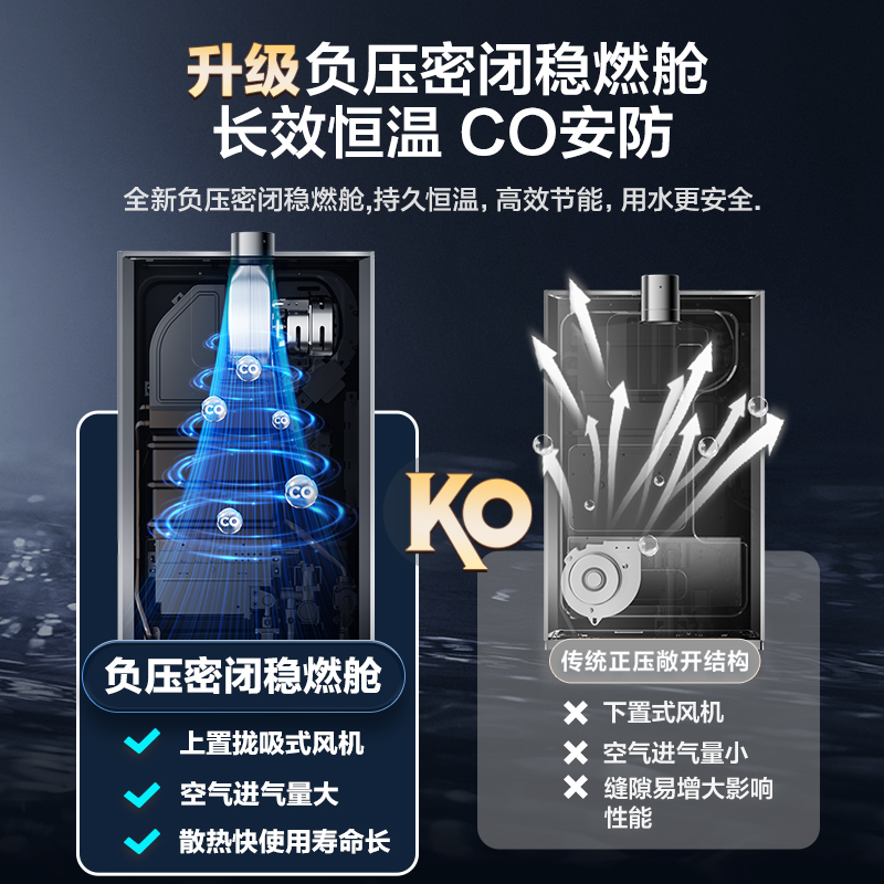 美的此款JSQ25-MK3燃气热水器每分钟热水产率13L,排烟方式为强排式,内置水量伺服器,能够将水温波动控制在± 0.3℃。支持智能变升技术,三档可调,满足日常多种需求。智能感知进水温度,采用磷脱氧铜水箱以及磁化净水技术,抑菌率官方宣称可达99.99%。内置智能ECO技术,支持全程风压检测,6重安防措施。产品能效等级2级,容量为13L。采用美的第四代恒温技术,搭载双变频水量伺服器,自动感温,精准稳压控流,升级银离子抑菌,24h实时监控各项数据变化,智能NFC轻触开启。