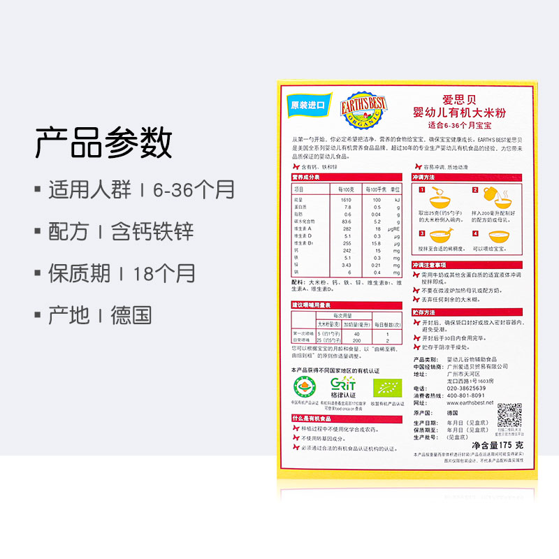 当前的位置: 首页 > 今日值得买 > 爱思贝(EARTH’S BEST) 宝宝钙铁锌米粉 地球世界婴幼儿辅食米糊 高铁有机大米粉175g(辅食添加初期)