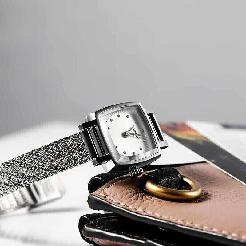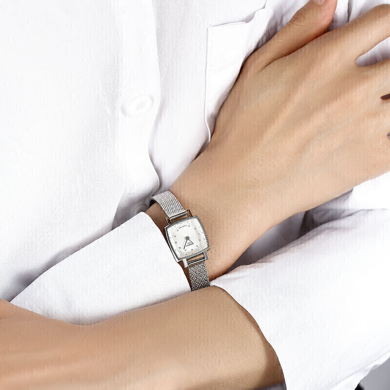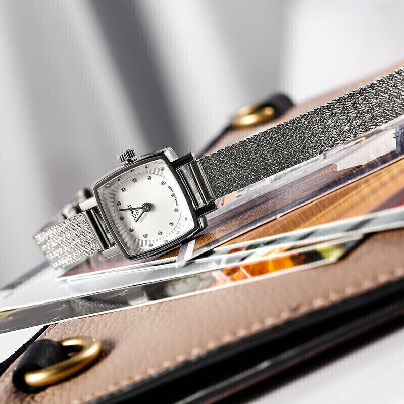 瑞士天梭(TISSOT) Lovely 系列这款银色女士优雅腕表采用银色不锈钢表壳,防水深度为30米,石英机芯,防刮蓝宝石水晶镜面,刻度标记加上指针标识,方形表盘气质满满~搭配上银色表链,凸显品质,而且很优雅~纤细的表链更加修饰手腕线条哦,而且也很百搭,日常都很适合。