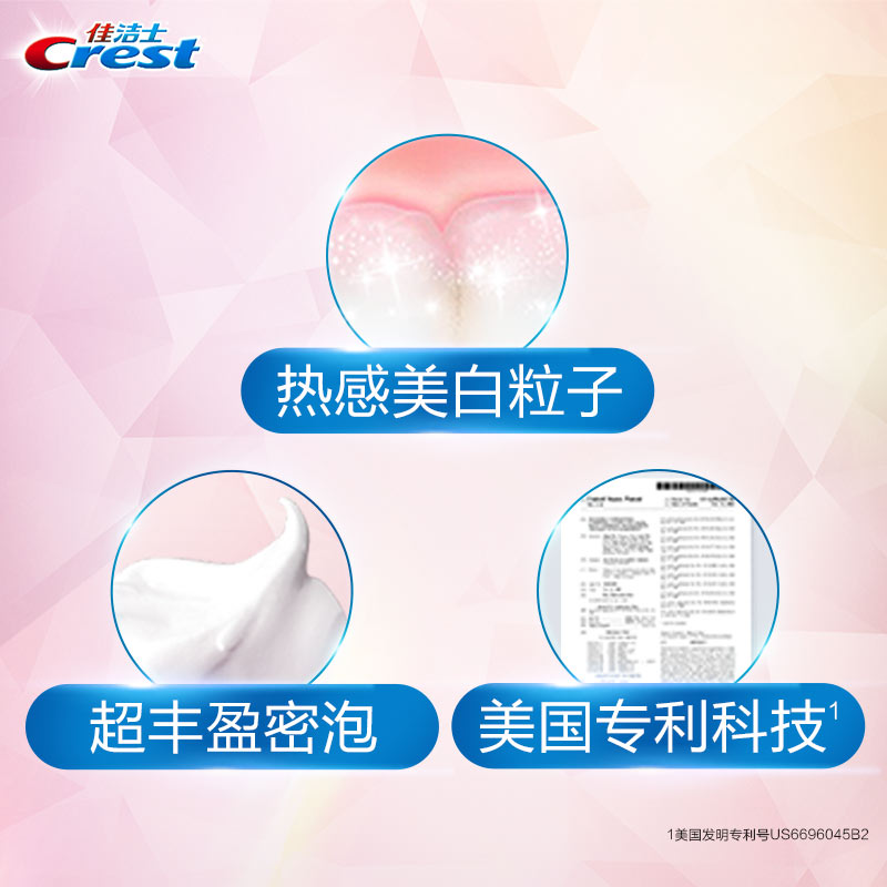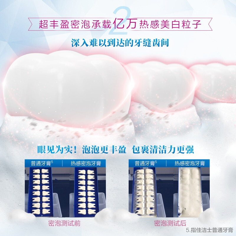 这款3D炫白系列 热感密泡钻白牙膏,泡沫细腻很容易冲漱干净。这是一款热感美白牙膏,全新升级的热感去渍科技,刷牙时高效产生热感,有效软化顽固牙渍,通过超丰盈的密细腻泡泡,搭载亿万热感美白粒子,能够深层清洁死角盲区的齿缝。清新花果香,清甜沁脾的香味在口中蔓延,晶莹透亮的高颜值膏体,增加刷牙时的乐趣~
