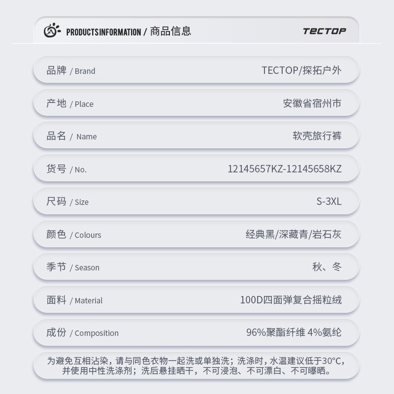 TECTOP 探拓 男女款户外弹力裤 12145657KZ,采用100D四面弹复合摇粒,抗皱耐磨,柔软舒适,不易起球,半松紧断腰设计,膝位立体裁剪。