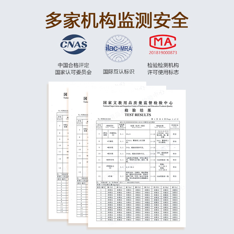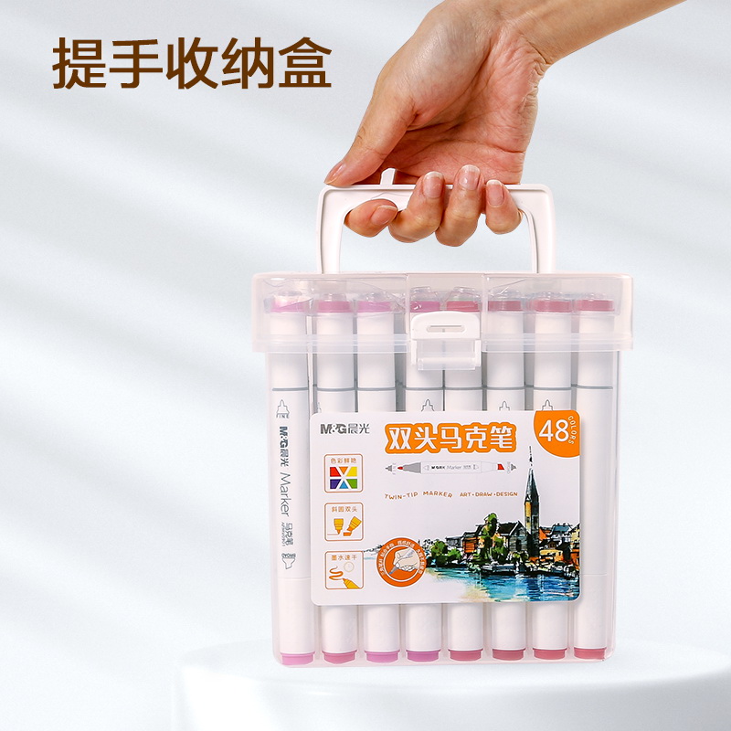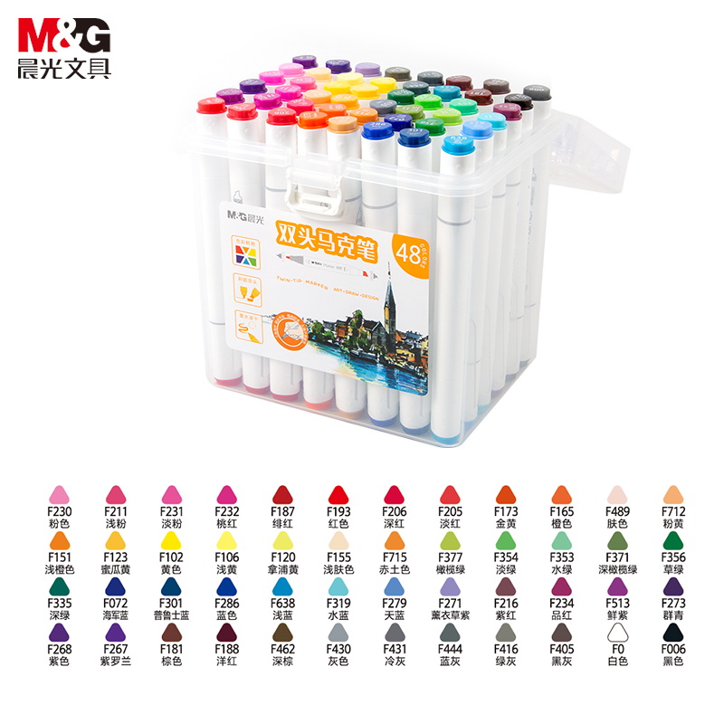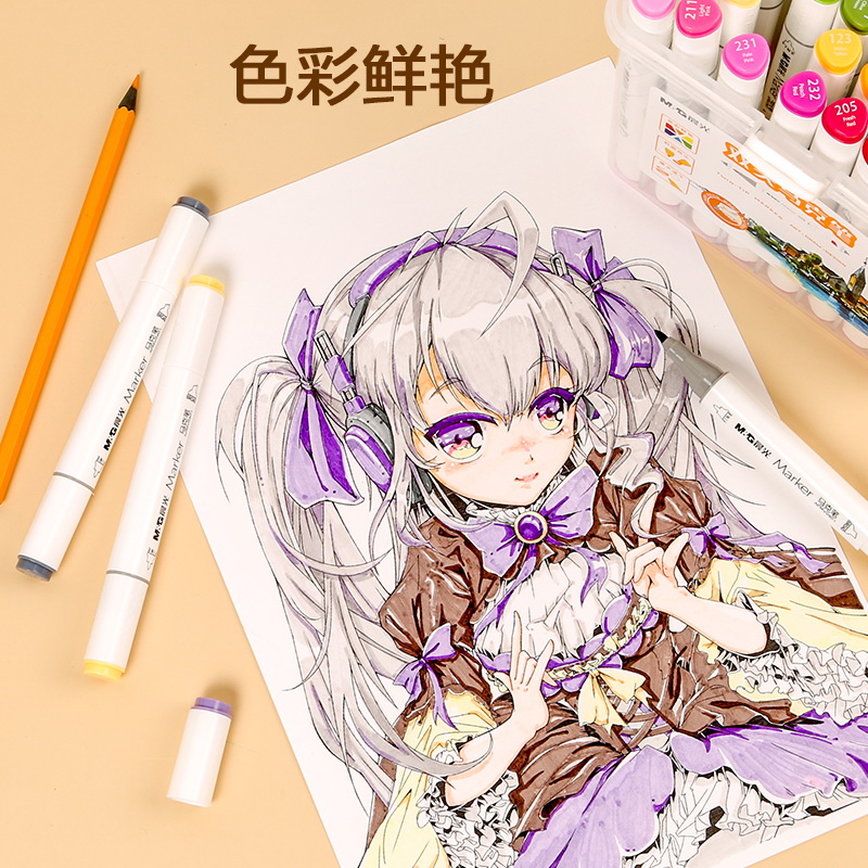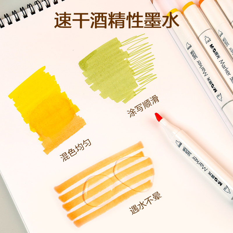 粗斜头+小圆头设计,满足不同绘画需求,使用方便灵活;上色笔触痕迹少更均匀,涂写顺滑;颜色鲜艳且色细腻,遇水不易晕染。