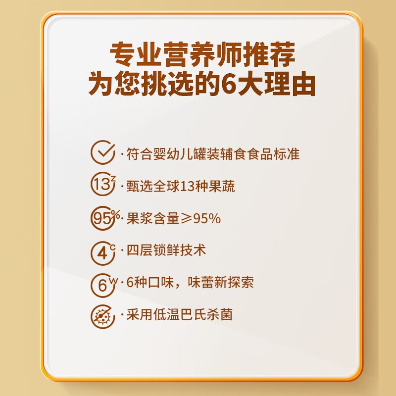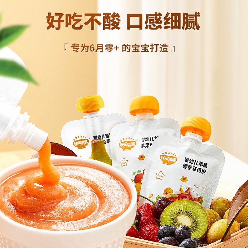 这款秋田满满 婴儿零食水果泥甄选全球13种果蔬,果酱含量大于95%,配料简单干净,不加1滴水,居家旅行随身带水果想吃就吃。
