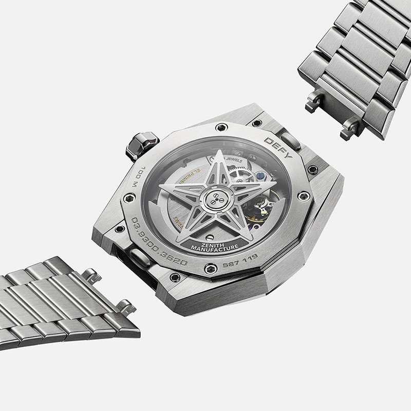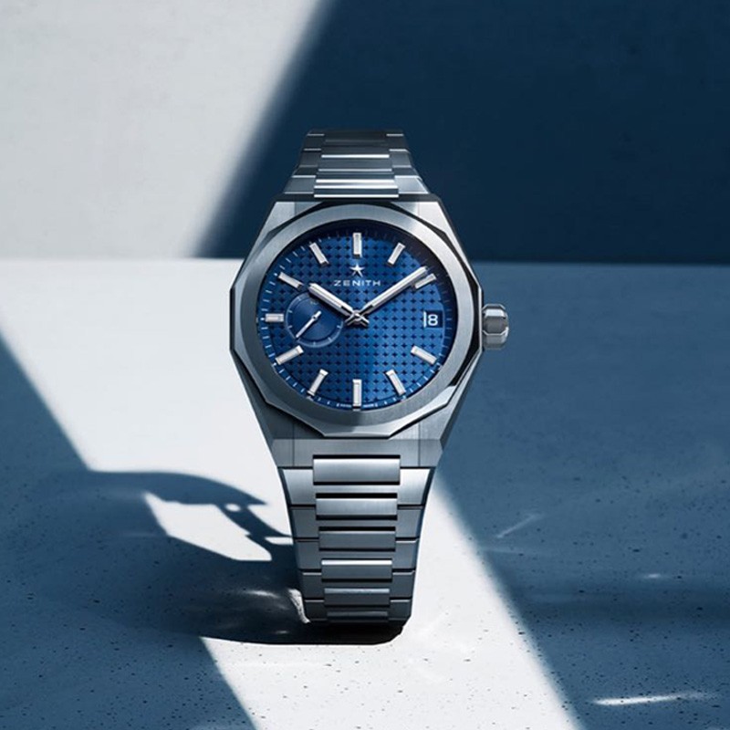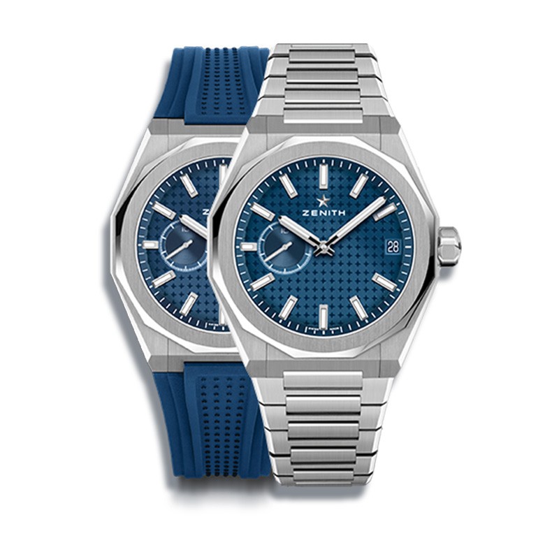 DEFY Skyline天际腕表采用41毫米八边形精钢表壳,带刻面表圈,搭配蓝色太阳纹表盘,重新演绎真力时富有代表性的四芒星标志。搭载El Primero 3620型高振频自动上链机芯,并首次配备1/10秒指示。可更换精钢表链和蓝色图案橡胶表带。