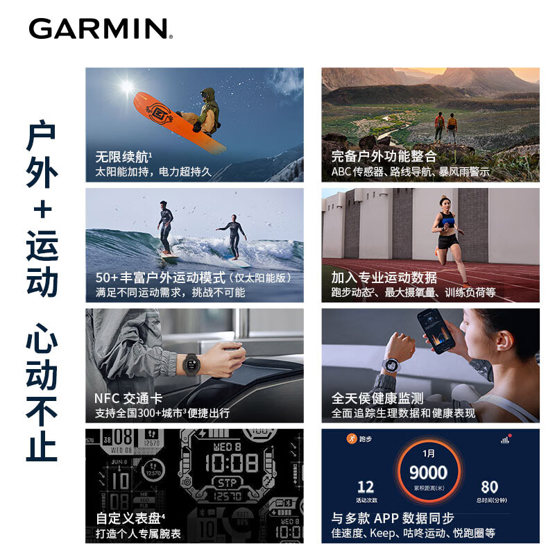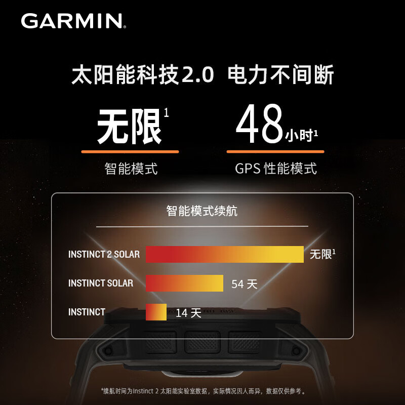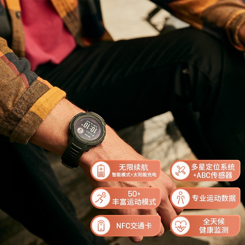 GARMIN 佳明 Instinct 2 运动手表,内置多种运动模式,如跑步、骑行,游泳,力量训练,室内攀岩,虚拟跑步,高尔夫,瑜伽以及更多。设计坚固、耐热、防震,100米防水。纤维增强聚合物外壳,康宁®大猩猩®玻璃太阳能镜面,造就这款坚固耐用。亮丽的配色,搭载阳光下清晰可视的高对比显示屏,两种尺寸可供选择,戴上它成为人群中的焦点。智能模式搭配太阳能充电可实现无限续航。结合电源管理还可以有效延长电池续航。无论是步行、越野骑行、越野跑,还是滑雪,都可以连接全球卫星定位系统(GPS、GLONASAS、北斗),相比单独的GPS系统定位,更能避免复杂户外环境的干扰。内置 ABC 传感器,包括可测量海拔的高度计、监测气压变化的气压计以及 3 轴电子罗盘,在户外探险中不再担心迷路。