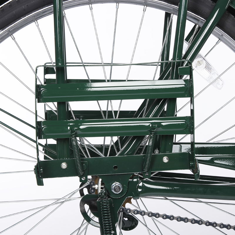 二十世纪八十年代自行车是中国家庭的“三大件”之一。凤凰使用了传承半个世纪的车架,搭配原汁原味的设计,造就了这款车的正统气质。采用铜焊接头车架,搭配静电涂装,经典杆闸,制动效果好,出行更安全。配有全尺寸挡泥板,阻隔轮胎带上去的泥水,清爽骑行。车后轮处装有邮政专属副货架,左右两边搭载重物,或乘坐时搁脚,功能多、作用大。自带车后架,结合副货架,载物带娃两相宜。前42后18齿的传动比,带来轻快却不失力量感的踩踏体验,全包围护链盒,保护链条不易生锈。