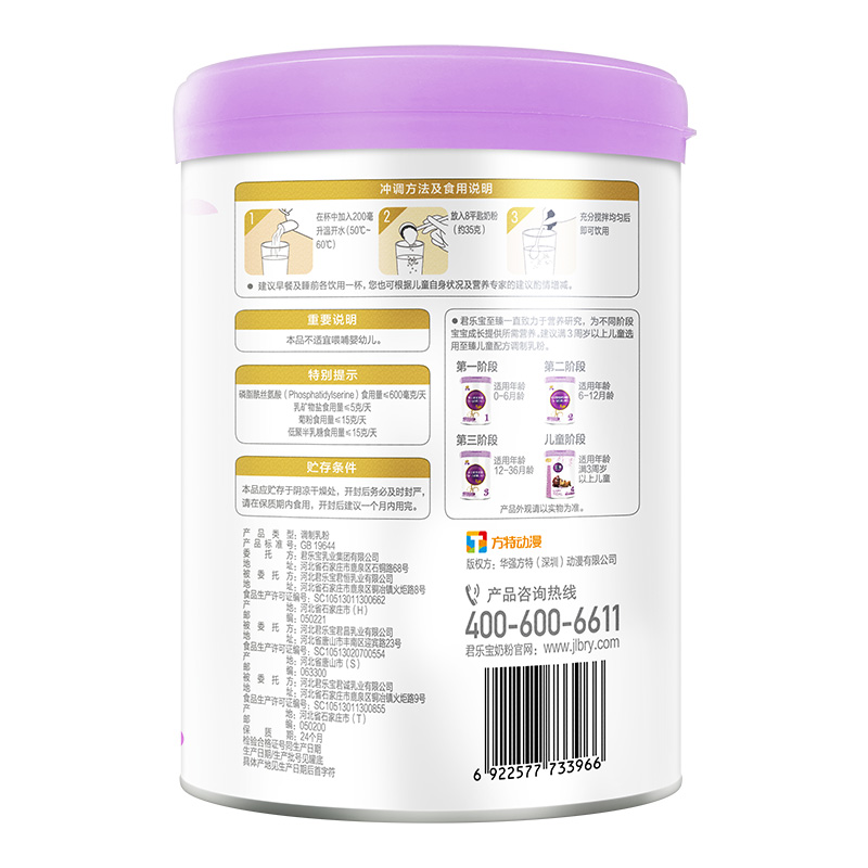 君乐宝成立于1995年,是河北省最大的乳制品加工企业,产品范围包括婴幼儿奶粉、低温酸奶、常温液态奶、牧业四大板块,其中婴幼儿奶粉在2014年正式开始生产,旗下有至臻、乐铂、恬适、乐纯、旗帜、乐臻、小小鲁班等系列,这款至臻系列主打的卖点是添加了优量的CPP(酪蛋白磷酸肽),每100g含有35mgCPP,能有效地促进人体对钙、铁、锌等微量元素的吸收和利用,有利于宝宝骨骼发育,还添加了OPO结构油脂,帮助宝宝更好的吸收和消化营养,减少便秘的发生,配方中还含有3大类营养元素,5种核苷酸促进宝宝生长发育,3重益生元呵护宝宝肠道健康,α-乳清蛋白小分子更易吸收宝宝肚肚舒服。