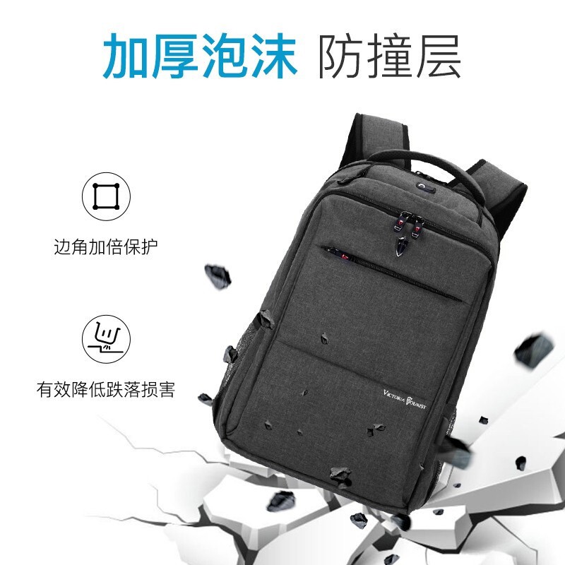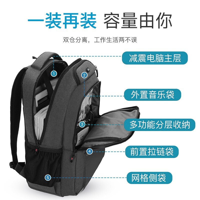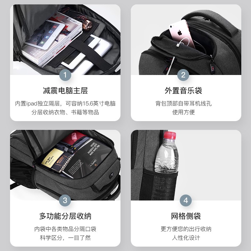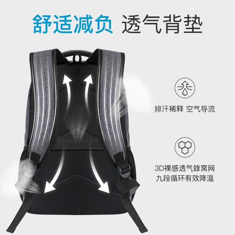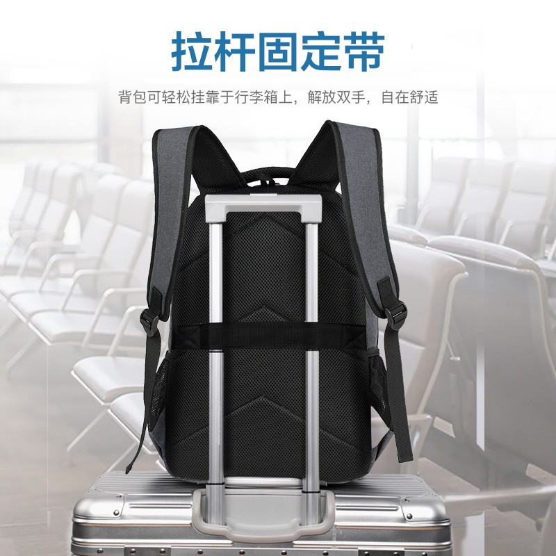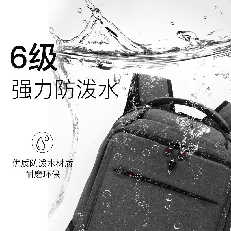 该电脑包尺寸:33*18*50cm,容量为17.3英寸,重量约0.79KG,采用优质防泼水材质,耐磨、环保、结实耐用 好背包精选好面料。侧开前仓、主仓功能袋、独立数码仓三个不同收纳分区。电脑ipad双收纳层,书包拥USB3.0外充接口可配合充电宝使用。透气背垫,S型加宽背带背负更省力,拉杆固定带,背包可轻松挂靠于行李箱上。