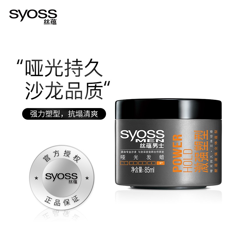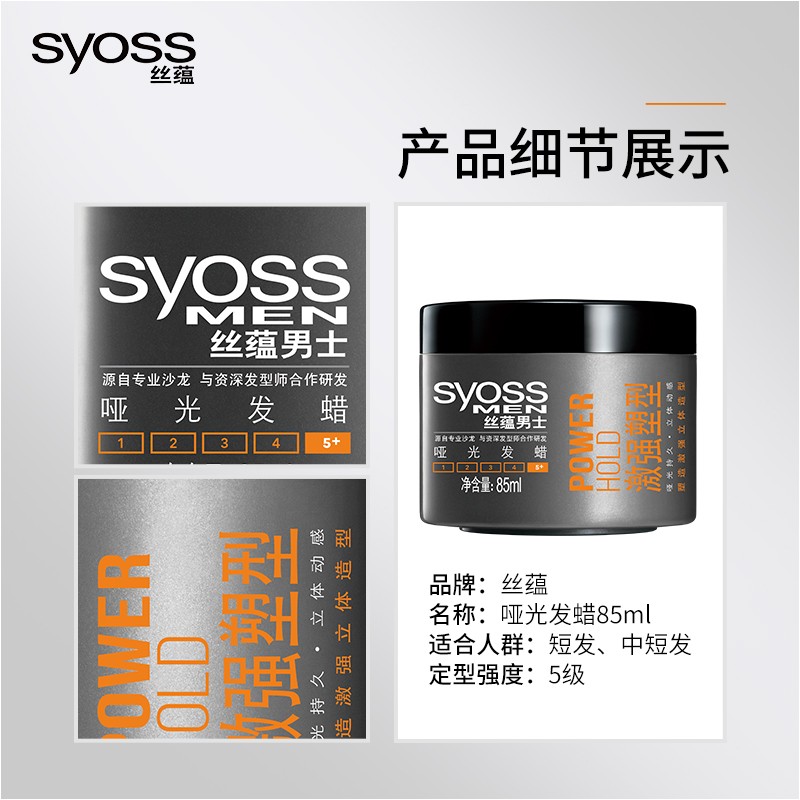 这款丝蕴(syoss)男士激强塑型哑光发蜡 是一款强力定型发蜡,定型力较强,哑光质感,清爽不粘腻。蓬松效果,动感立体不扁塌,快速干爽,易于清洗。适合短发、中短发人群。