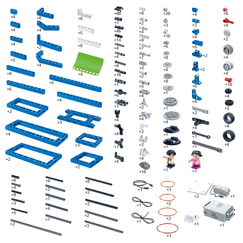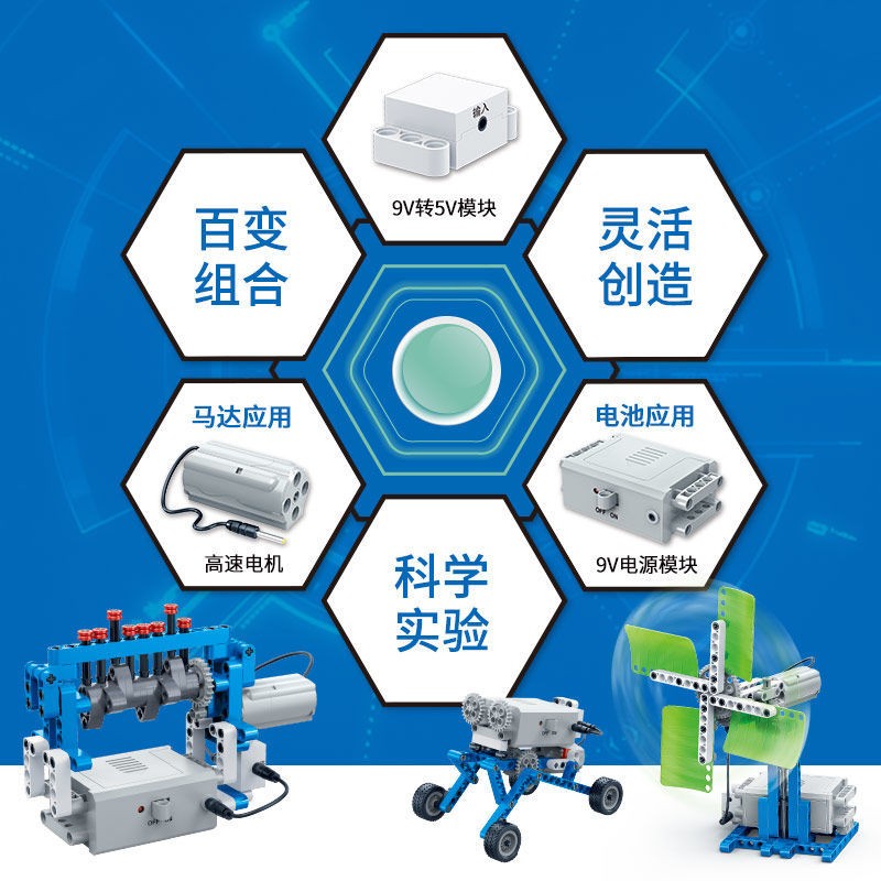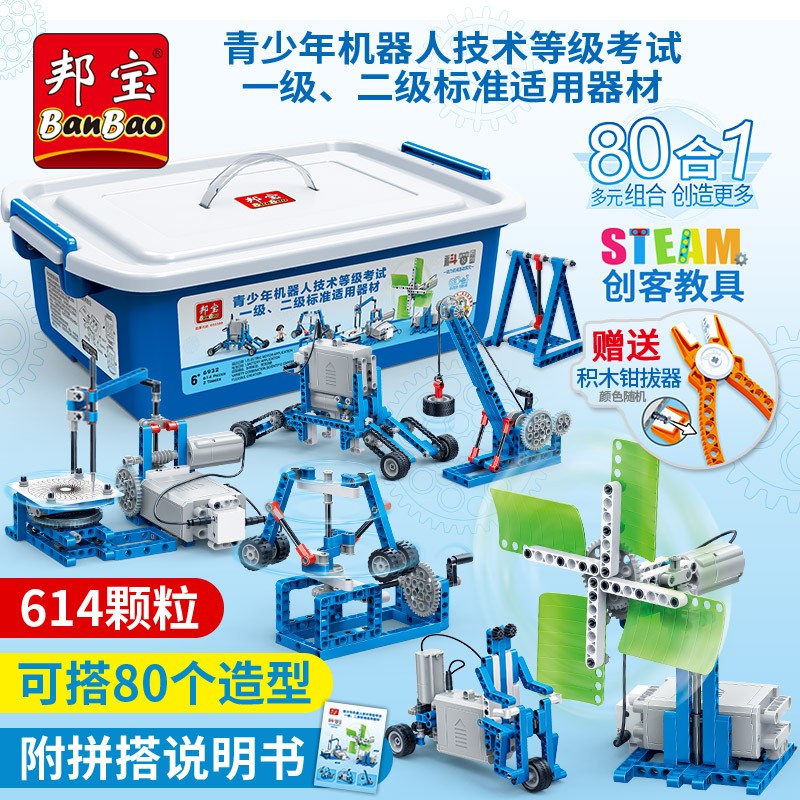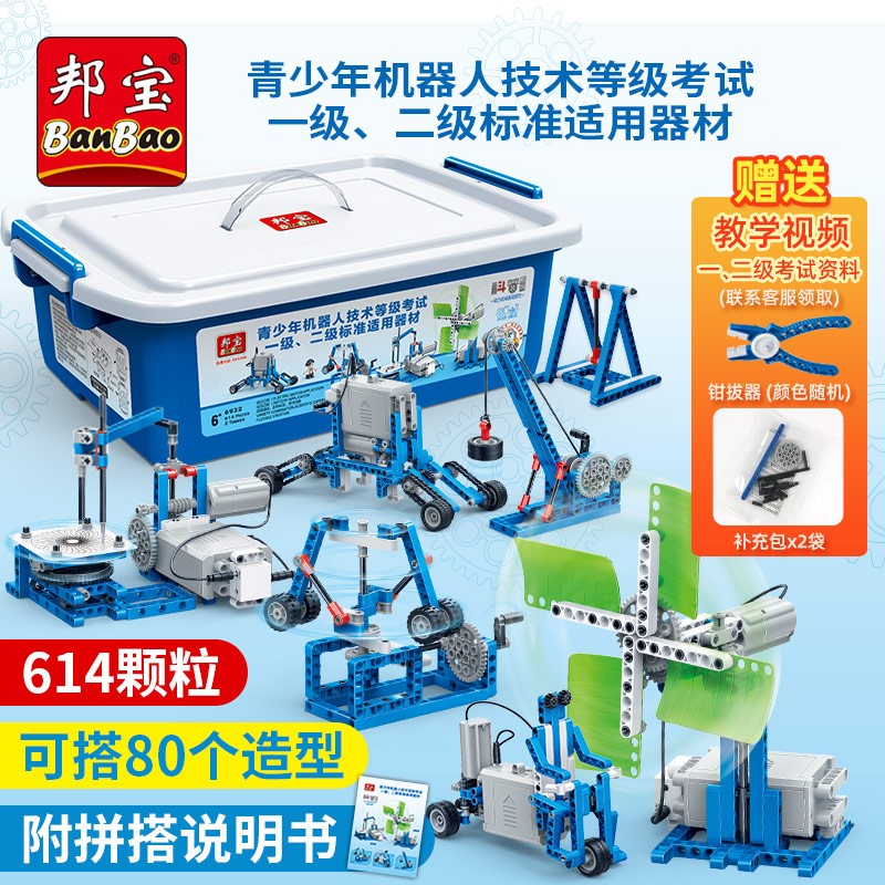 邦宝机器人教材 动力机械基础研究 6932,含有614颗粒,可以拼搭80个造型,附拼搭说明书,可学习到形状的稳定性、力的原理、杠杆原理、轮轴原理、滑轮原理、能量转化、电的知识、动力传输、皮带轮传动、运动机构、齿轮传动等相关知识点。