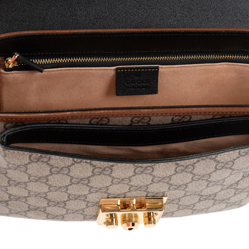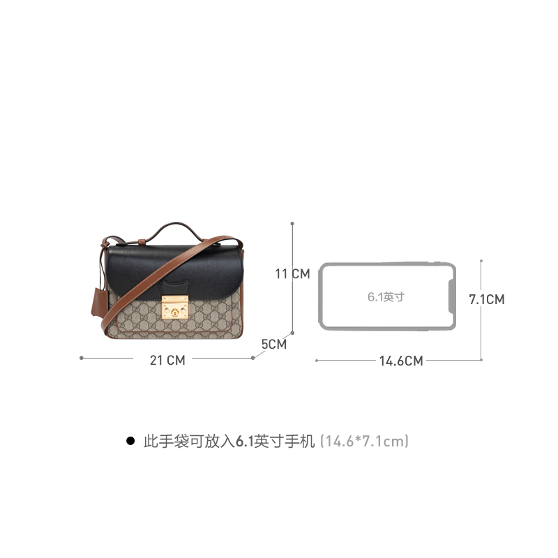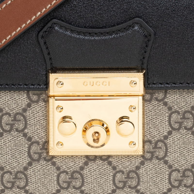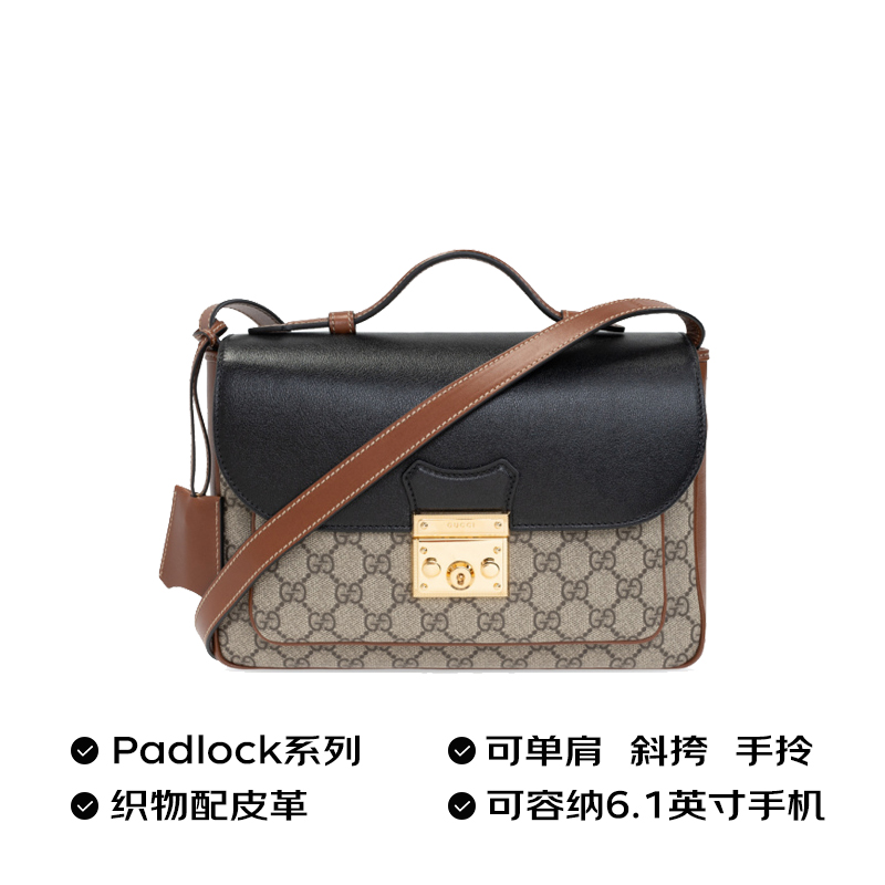 无边序曲系列以迷你造型演绎品牌标志性风格。这款Padlock单品以小巧玲珑的造型焕新演绎,采用GG Supreme帆布材质,顶部为黑色皮革。该系列标志性的挂锁与锁眼让整款设计倍添魅力。