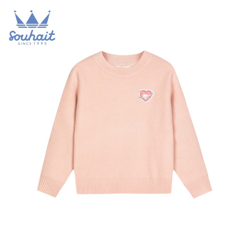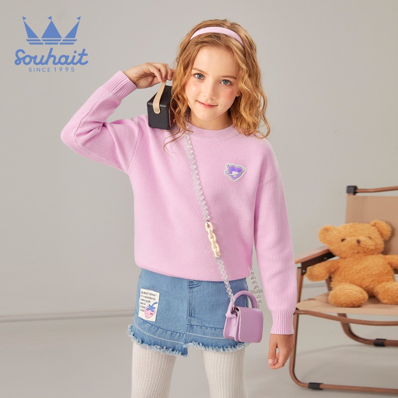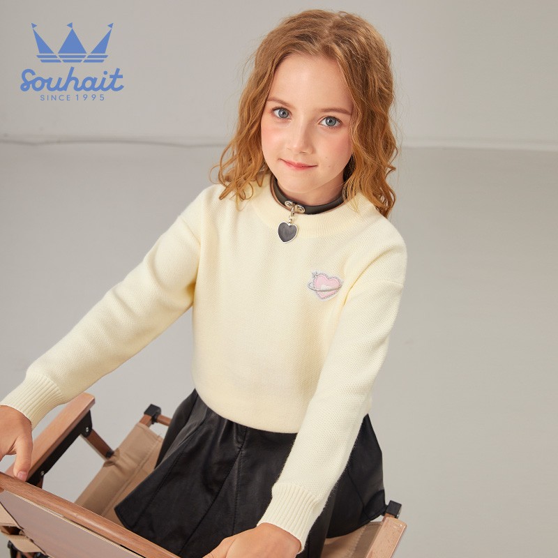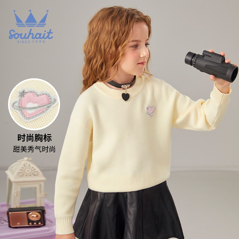 Souhait 水孩儿 女童毛衣,柔糯亲肤,倍感舒适,弹力不易变形。加宽罗纹领,舒适穿着,时尚简约。微收罗纹袖口,包裹手腕,有型利落。