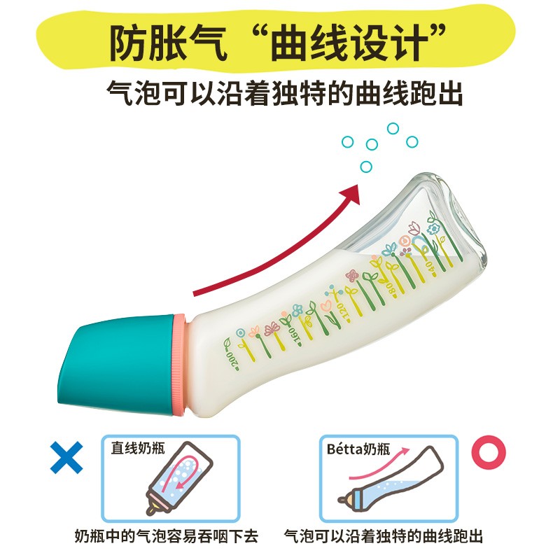 Bétta 蓓特 婴儿奶瓶 200ml,实现理想的哺乳姿势,是蓓特奶瓶设计为曲线形状的原因,智能奶嘴和助产士共同研究开发出来的,培养宝宝咬合咀嚼能力的奶嘴。