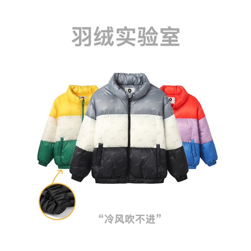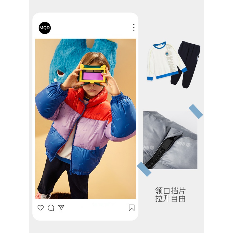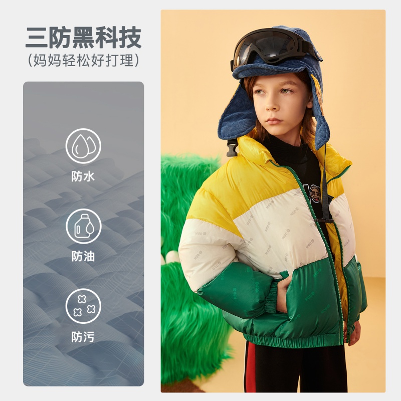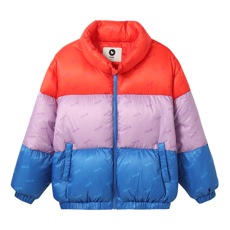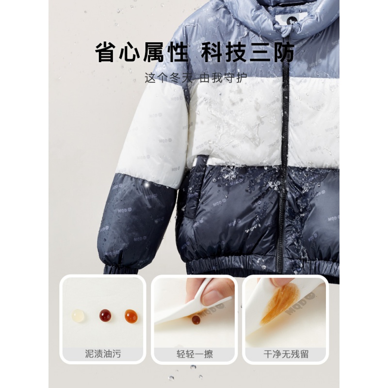 MQD 马骑顿 儿童满版拼接面包服,满版拼接撞色设计,轻柔保暖,领口挡片,拉升自由,省心属性科技三防,防水防油防污,轻轻一擦干净无残留。