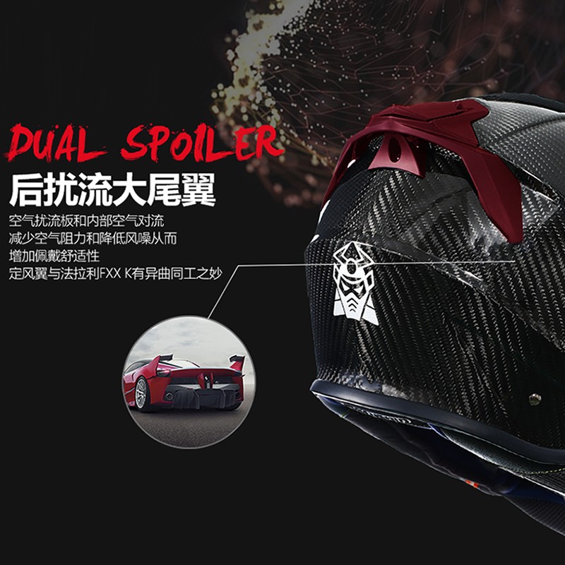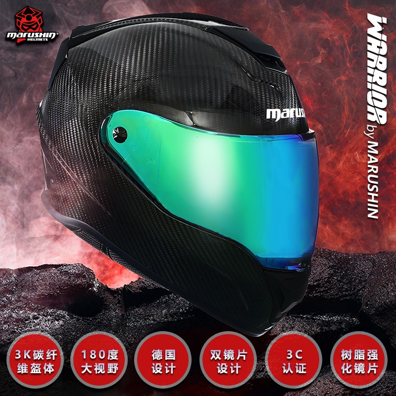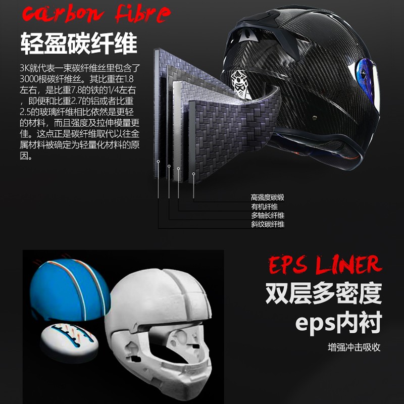180度视角骑行视野更大,左右两侧视野和没有戴头盔时候一样;从设计到做工都相当细腻,首先为了达到轻量化的目标,能减轻骑士配戴时的负担;3K就代表一束碳纤维丝里包含了 3000根碳纤维丝。其比重在1.8 左右,是比重7.8的铁的1/4左右,即便和比重2.7的铝,或者比重2.5的玻璃纤维相比依然是更轻的材料,而且强度及拉伸模量更佳。这点正是碳纤维取代以往金属材料被确定为轻量化材料的原因