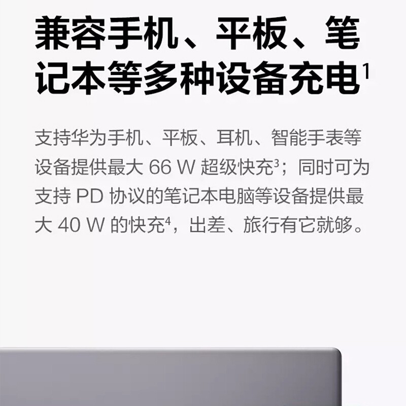华为此款氮化镓充电器,创新超薄构架,采用高效合封GaN氮化镓与COB高集成平板变压器,在支持华为 66W超级快充的情况下,将充电器厚度控制在仅10.5mm,支持华为手机、平板、耳机、智能设备等提供最大 66W 超级快充,同时可为支持PD协议的设备提供最大40W快充。内置十重安全保护,附赠50cm 6A快充线一根。