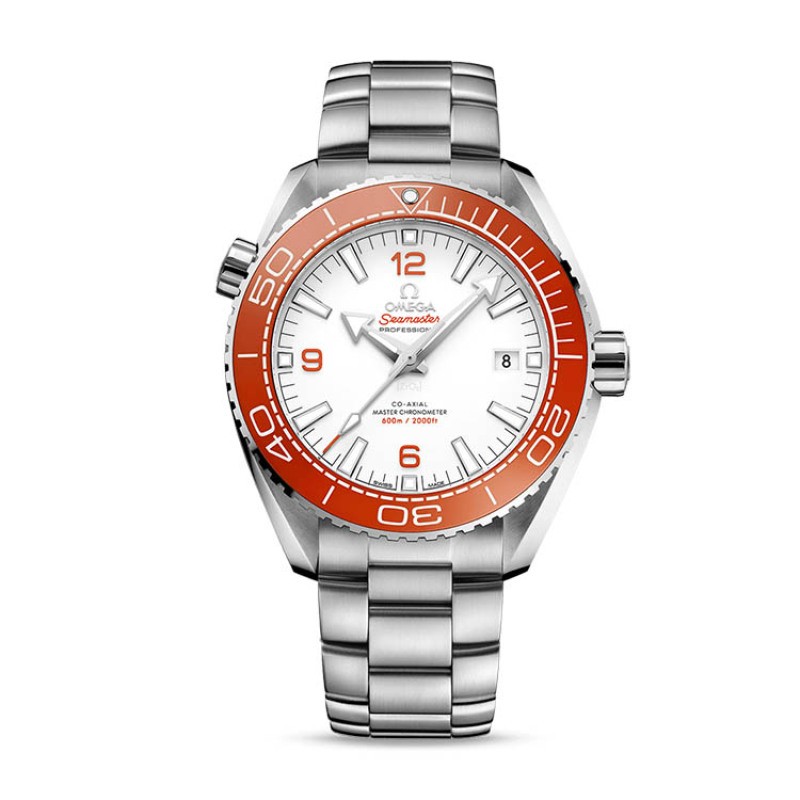 43.50毫米精钢表款搭配白色陶瓷表盘,表盘上贴镶橙色阿拉伯数字时标,3点钟位置设有日历窗。橙色陶瓷单向旋转表圈上的潜水刻度覆以液态陶瓷和Super-LumiNova夜光涂层。其他设计特色包括齿槽状旋入式表背,一体式精钢表链搭配欧米茄特有的可折叠表扣和潜水延伸表带。