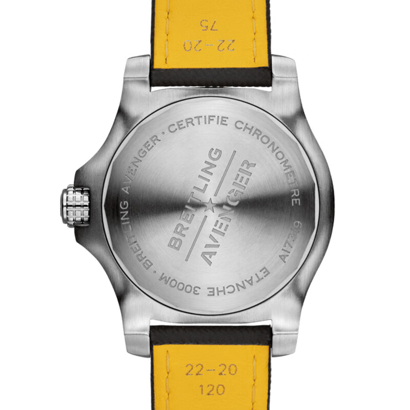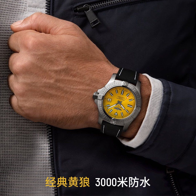 这款BREITLING 百年灵 Avenger II Seawolf 复仇者二代深潜海狼系列 M17331E2/I530-253S/M20DSA.4 男士机械腕表,采用Breitling 17机械芯制成,改良自ETA2824-2,有25颗红宝石。除具有复仇者系列坚固可靠、性能稳定、走时精准的特点外。黑色精钢表壳,单向棘轮式表圈,眼镜蛇黄色表盘,夜光指针和时标,3点钟位置日期显示,耐刮擦蓝宝石镜面,烟煤色军用纤维表带,表径45毫米,厚度18.4毫米,支持防水3000米。