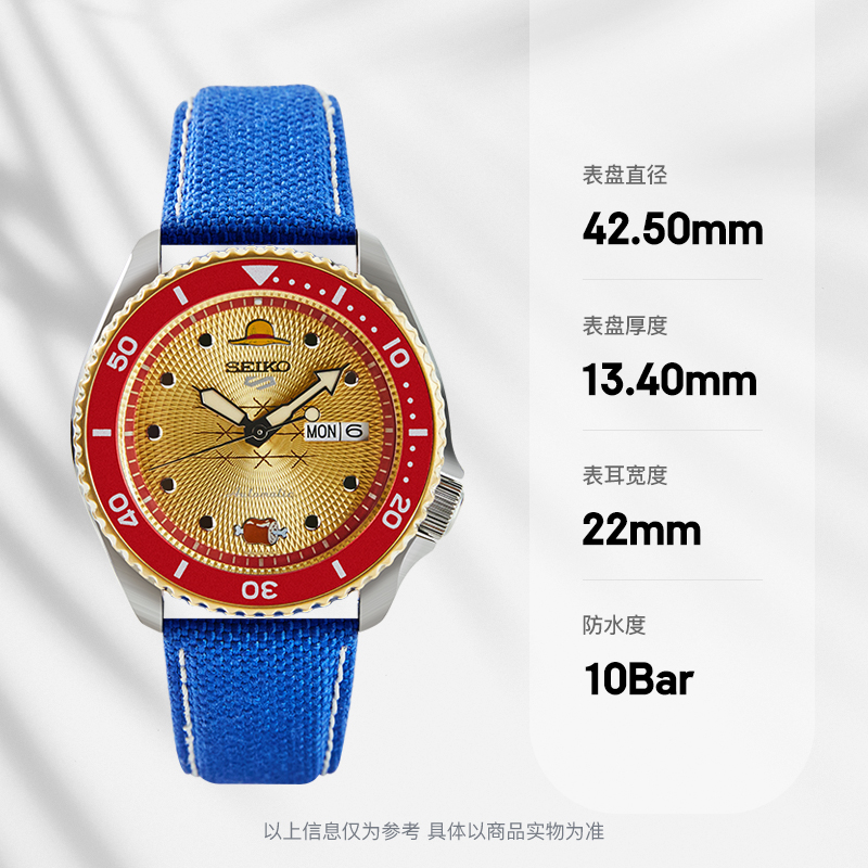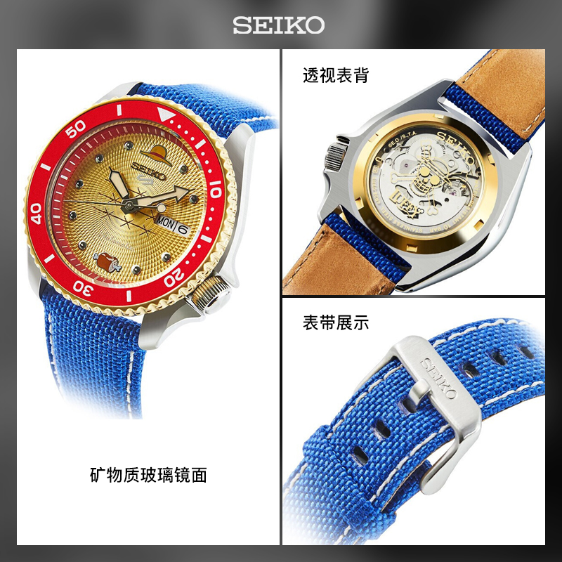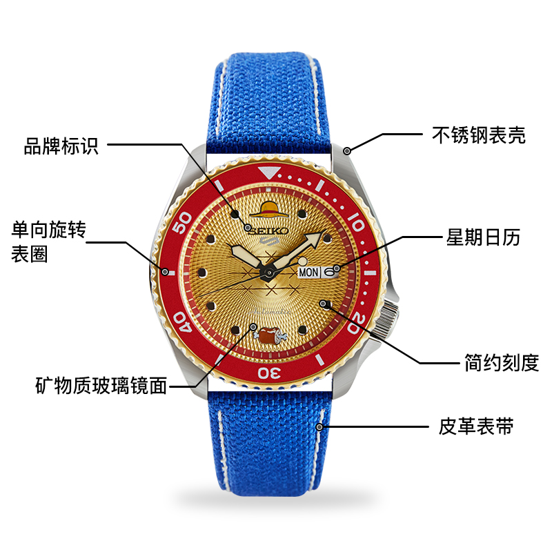 相信有不少聚友都非常喜欢海贼王这部动漫,正义的路飞、可爱的乔巴~在他们的世界里,和伙伴们在航海过程中一往无前,感动了无数的人。超人气热血动漫One Piece 与SEIKO联合推出联名款腕表,运用海贼中的草帽一伙中人物造型与经典元素,细节满满,本系列共有6款,路飞2款、佐罗、奈美、撒谎布、山智各一款,表面均有人物特征,腕表搭载4R36机械机芯,41小时动力存储,100米防水。