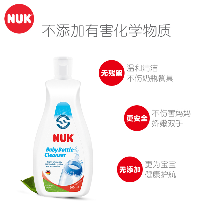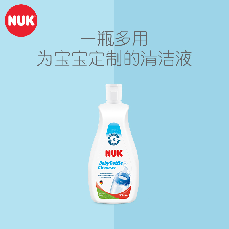 NUK 奶瓶奶嘴清洗液 ,天然温和,无香植物配方。如水样质地,更少化学添加,使用更安心。易冲洗无残留,绿色环保,可自然降解。泡沫丰富,轻松瓦解各种污渍,用量更省,去污力强。不伤器具、不伤手。