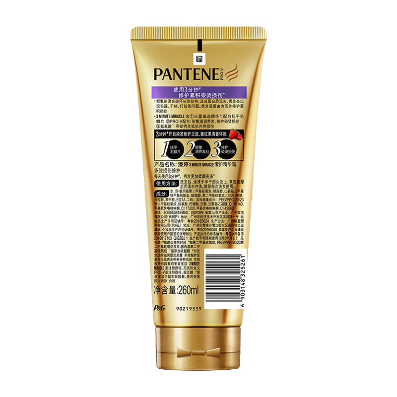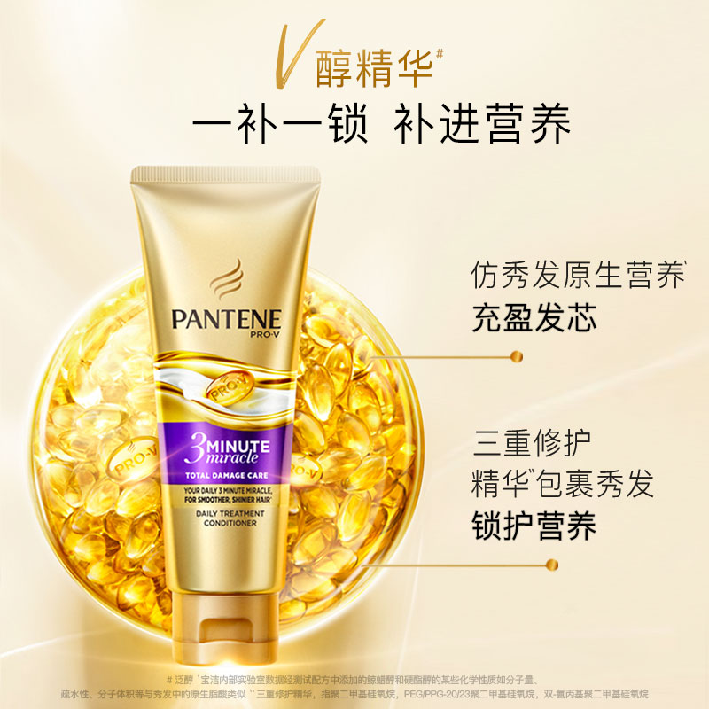 PANTENE(潘婷)是宝洁旗下国际领先的洗护发品牌,于1947年在欧洲创立,其产品专注秀发损伤修护,是护发素市场的领军品牌。这支这款潘婷3分钟奇迹护发素,一直有着很好的口碑,在网络上的讨论度也非常高。膏体呈现淡黄色的乳霜质地,涂抹在发丝上的渗透力很快,冲淋时也很方便,既能让发丝持久润泽,也不会黏腻扁塌,味道清甜,前调是红果之鲜味,中调是馥郁花香,后调是清新香草味。主要成分有抗氧化组氨酸和双重氨基酸精华,能形成发膜一样的保护层锁住色彩,配合潘婷拿手的明星护发成分“PRO-V维生素B5”加强修护补水,高纯度度脂醇配方可以精准渗透发芯,使秀发及时滋润,并持续抵御干枯。