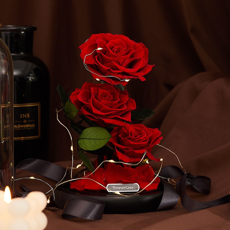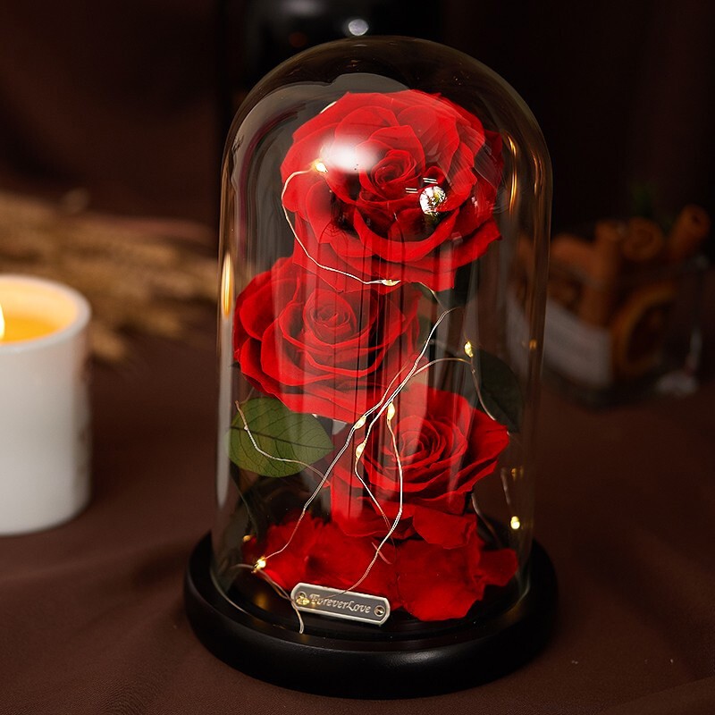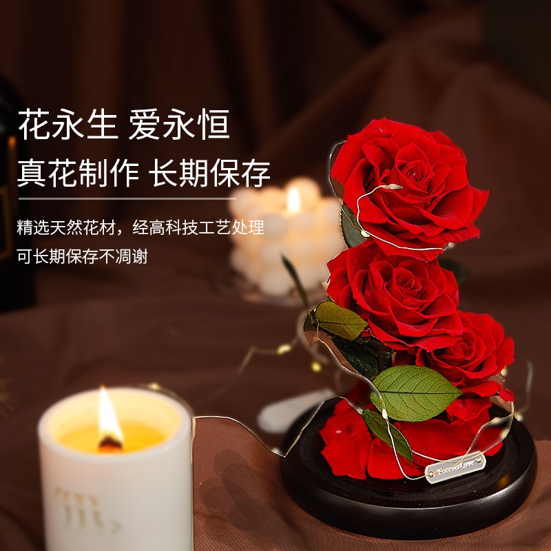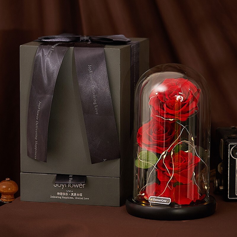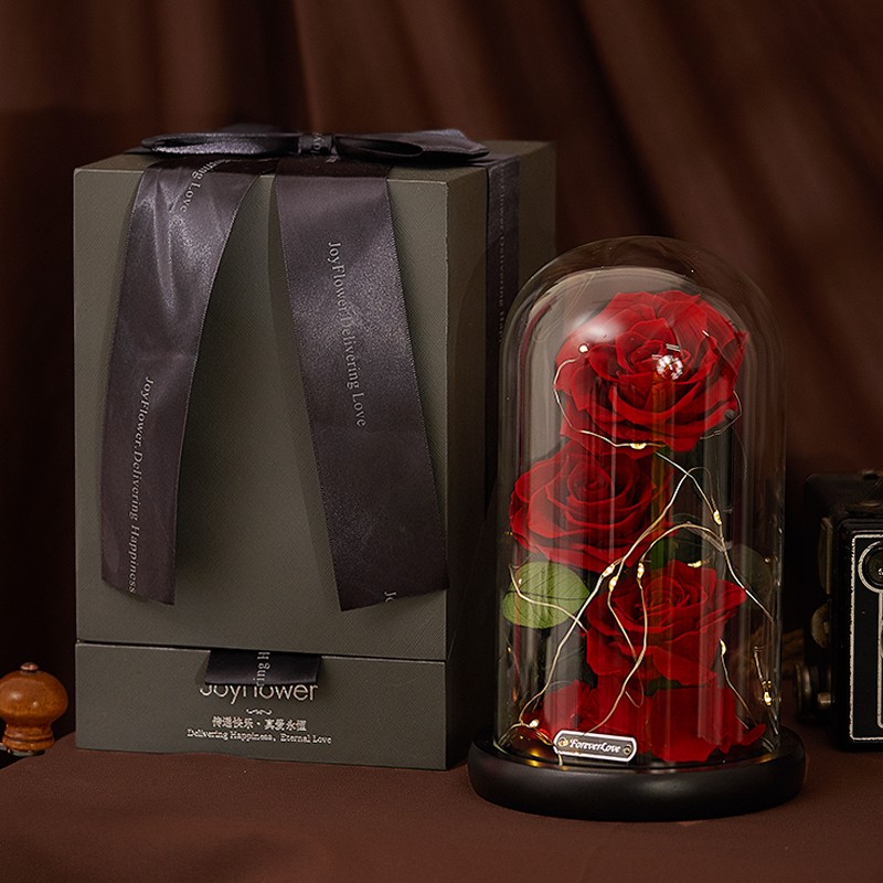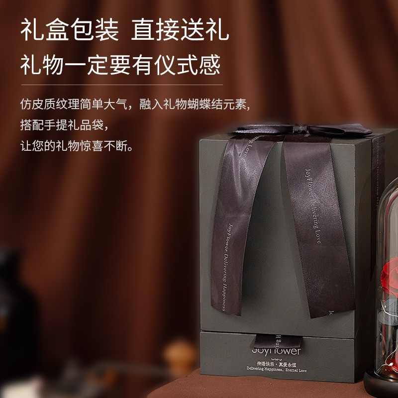 采用高科技手段对鲜花进行高速脱水、烘干等一系列复杂工序加工而成的,无论是色泽、形状、手感几乎与鲜花无异,保持了鲜花的特质。精选榉木制作而成,使用特殊工艺做旧打磨,富有质感;3朵进口永生玫瑰,使礼物更显大气,工艺完美呈现饱满的花瓣眼里的色泽;晶莹剔透的玻璃罩,怡好的展示了永生花花的美丽。