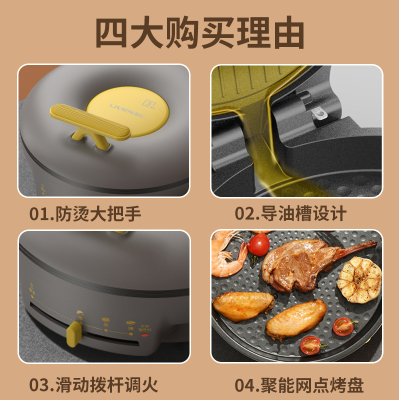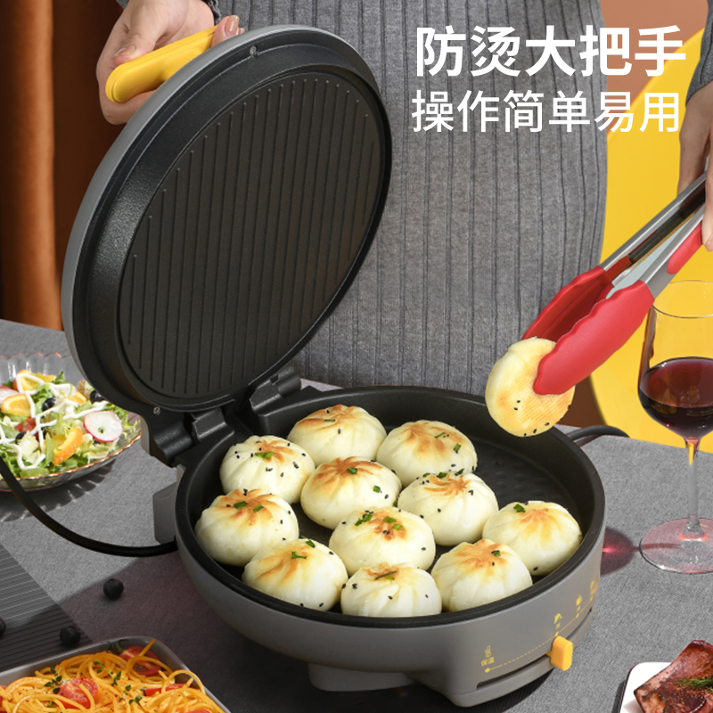 140C恒温保温,悬浮烙烤均匀加热。26cm烤盘直径 全家青睐自主烙烤,25mm加深烤盘 食材不挤压一次吃过瘾,1200W快速加热,美食外酥里嫩。健康不粘涂层 轻轻一擦清洁不费力。