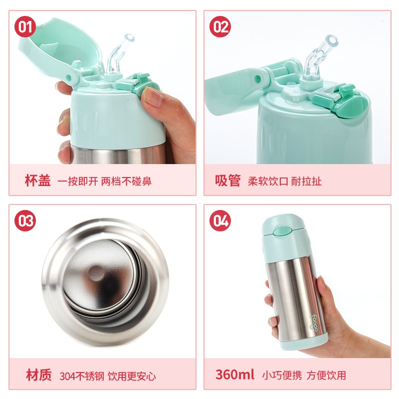 流线型杯身,中间细腰设计,符合人体工学设计,方便宝宝抓握。一键开合,可以单手打开闭合,方便操作。吸管盖子防漏,防止液体飞溅。广口设计,方便清洗,还可放冰块,带吸管,装热水时注意不要让孩子直接用饮用。真空不锈钢材质,10小时恒温把控。