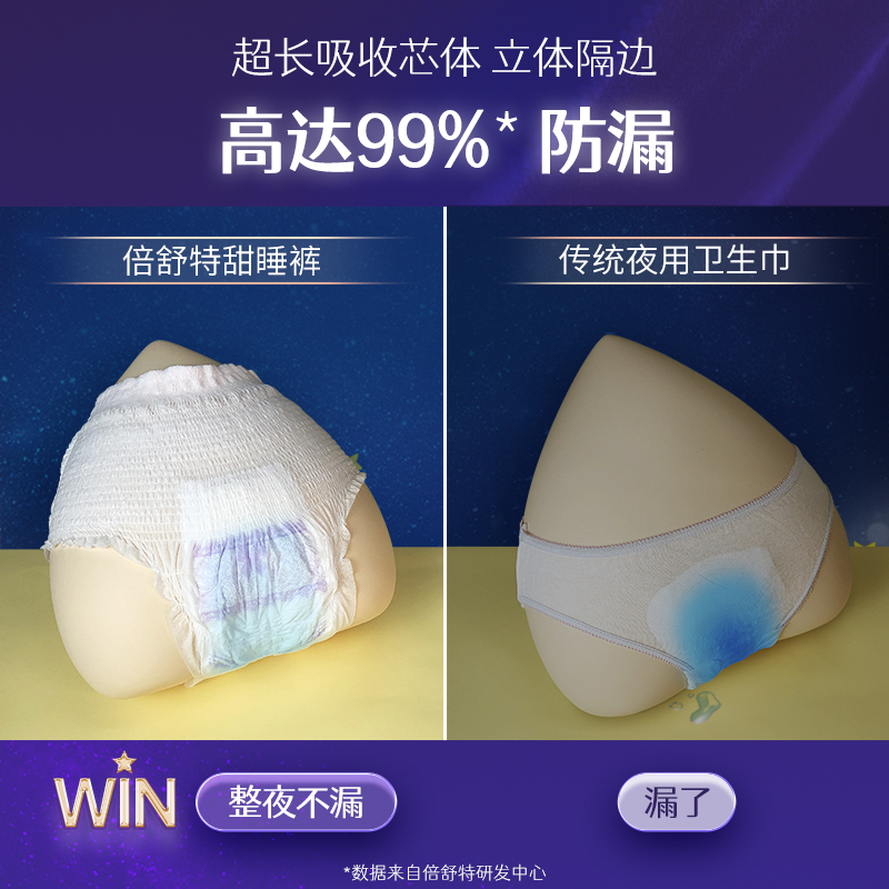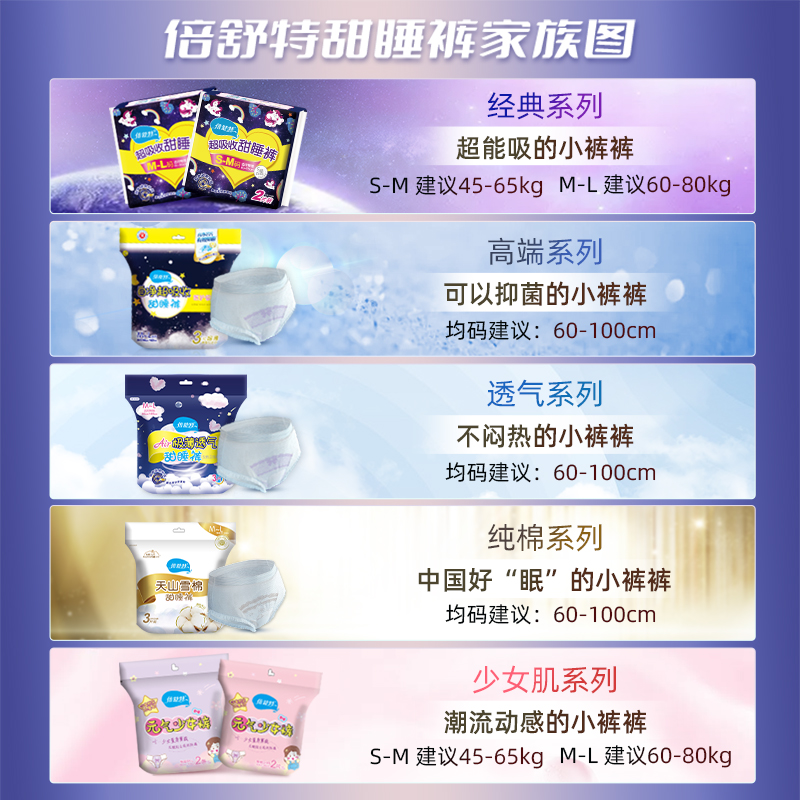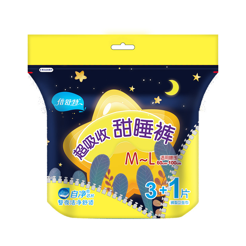 这款倍舒特甜睡裤纯棉表层,舒适亲肤,超大吸收量,瞬间吸收,反渗透;立体隔边设计,安心整晚不侧漏,剪裁贴身,花型蕾丝设计,满满少女心,独立密封小包袋,卫生放心~