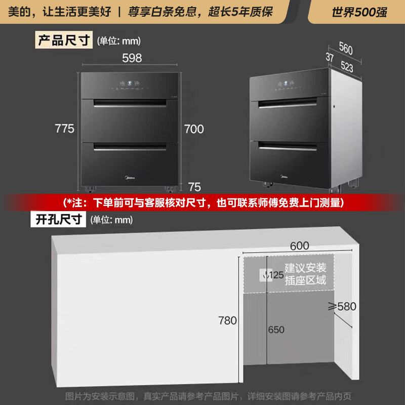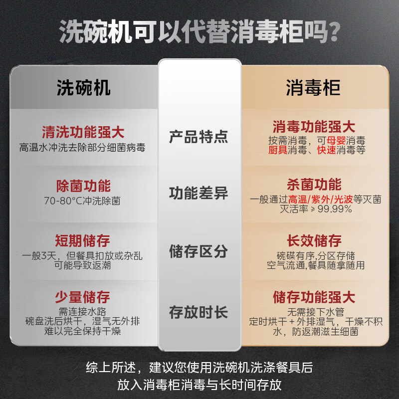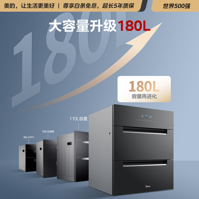 180L 双倍增容 775mm 充分利用厨下空间 三门三层 分区收纳更整齐 二星消毒 紫外+光波 10大定制模式 加厚发泡柜体 坚实、保温、节能 三重安全防护。大容量碗架,坚实耐用不锈钢材质, 每层空间非常充足,全家人的锅碗瓢盆都可以容纳,避免堆叠摆放确保消毒更彻底 餐具根据碗篮设计进行有序摆放, 避免堆叠摆放不易烘干、消毒不彻底等情况。