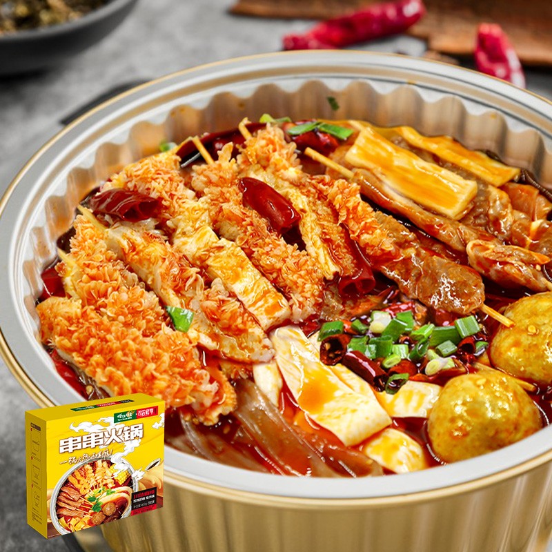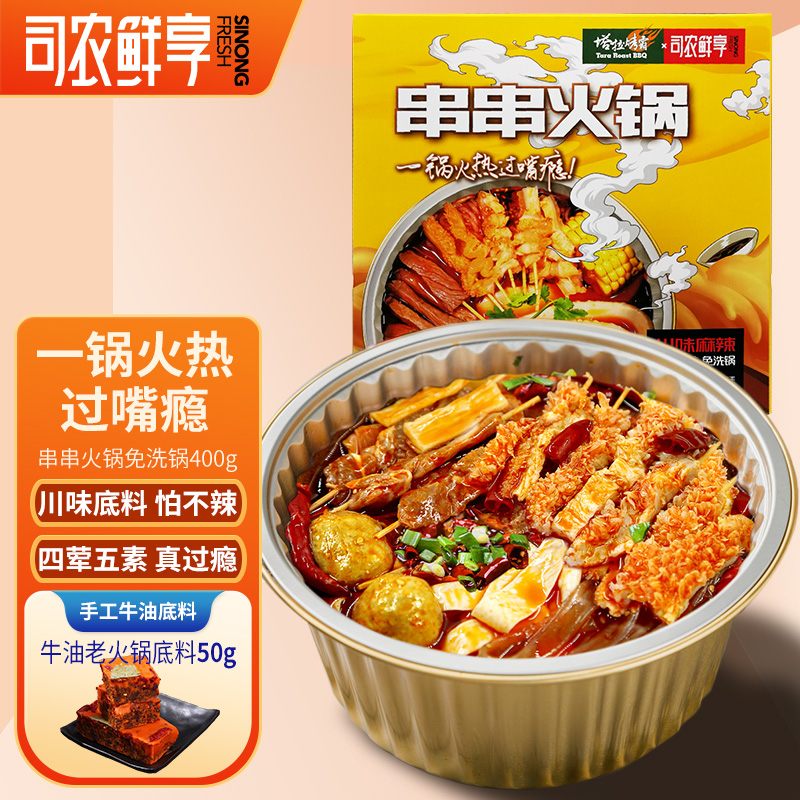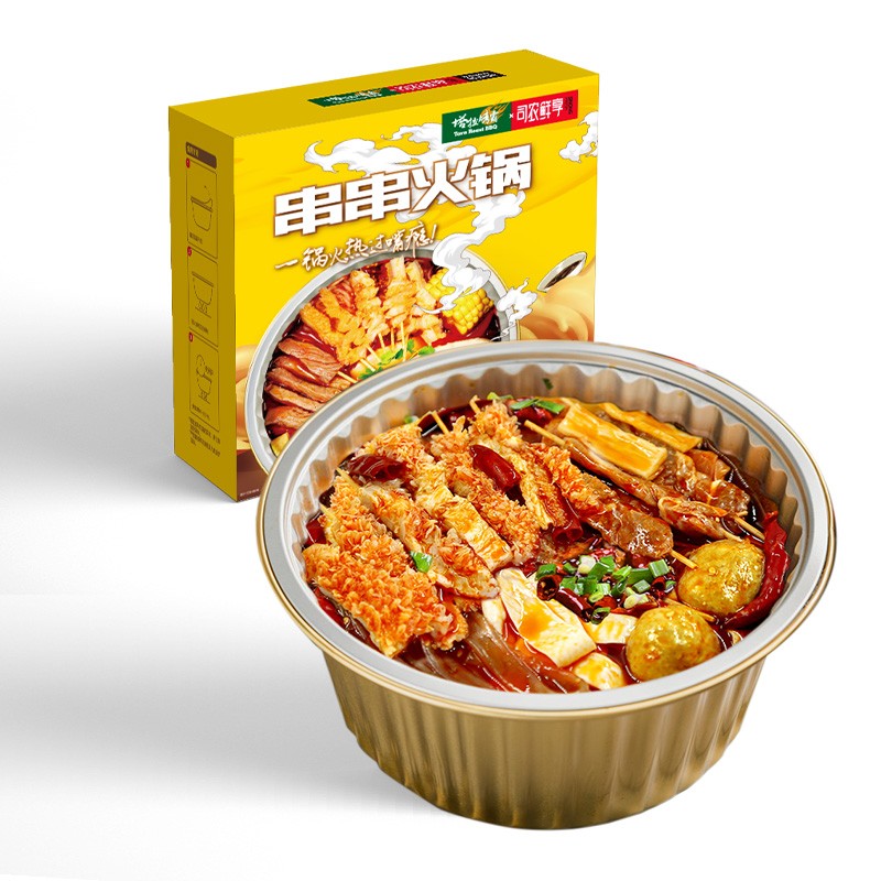 这款自助火锅,食材采用速冻锁鲜技术,保留肉串的新鲜口感,一份火锅中含有肥牛肉片、海带、豆皮、川粉、笋片、木耳多种食材,一份一盒,随时随地吃上火锅。