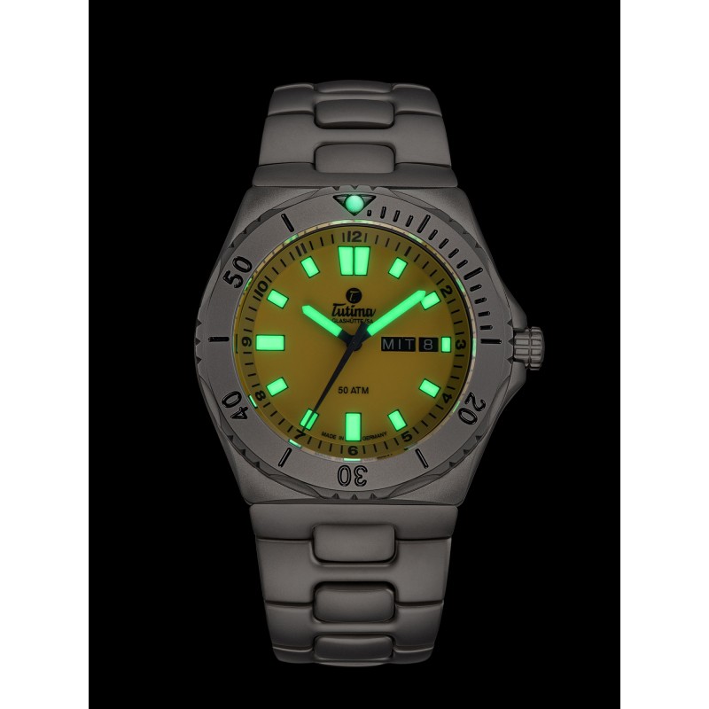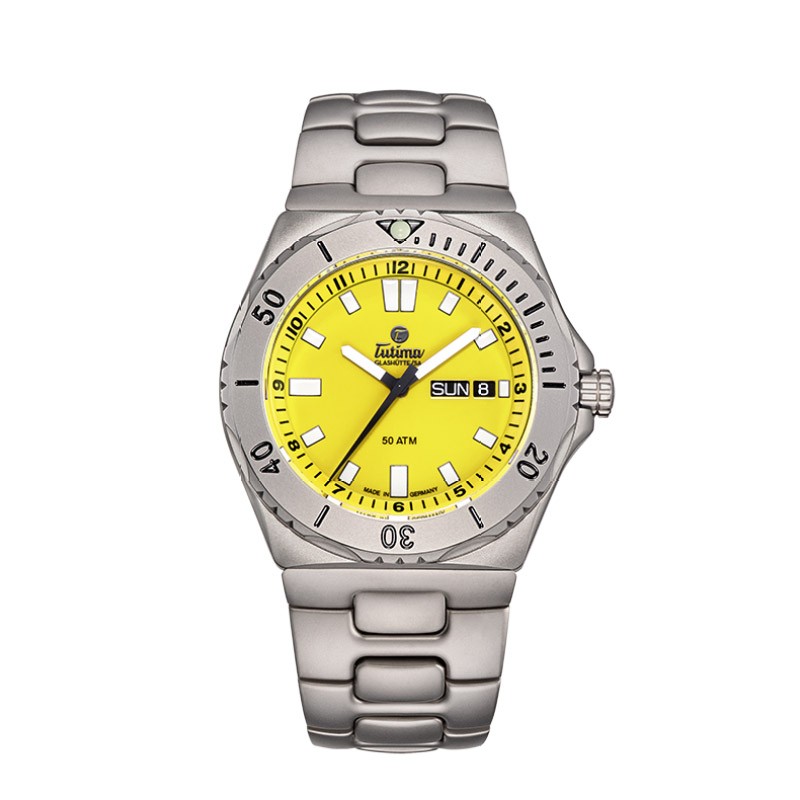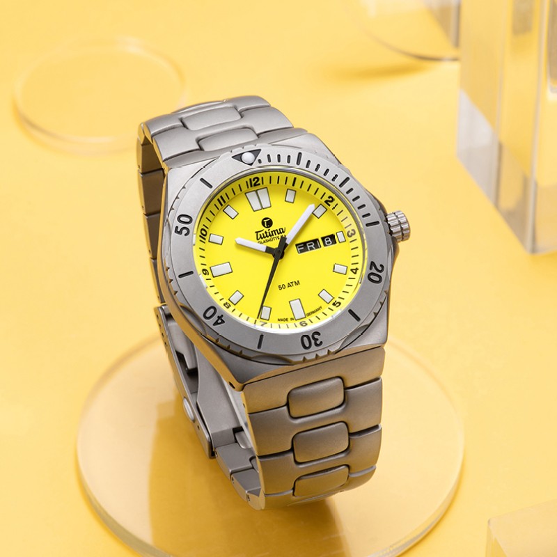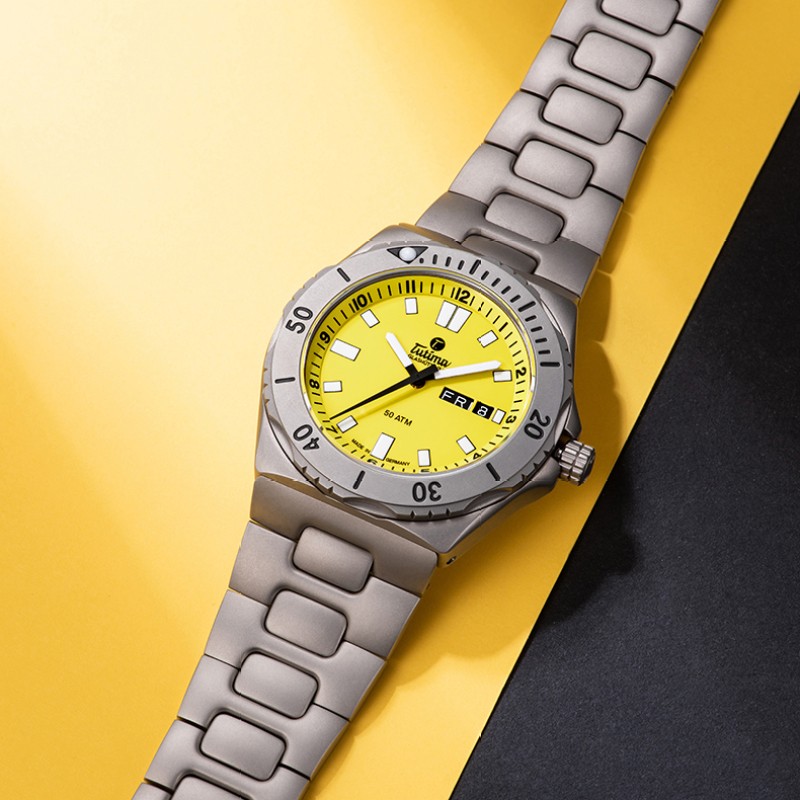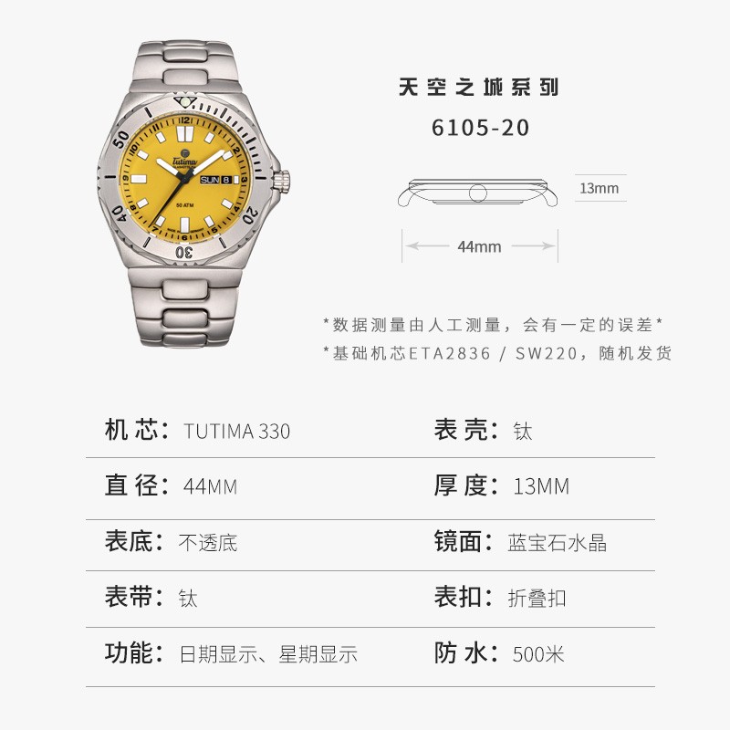 拓天马在军用时计的稳健性以及功能性设计基础上,引入醒目的信号色树立了潜水员手表鲜明的标签。为那些喜欢帆船,冲浪,游泳和潜水,等水上运动的勇者们提供了可读性。日期显示、星期显示功能。坚固的纯钛表壳,阳光帅气,与耀眼的黄色配合,仿佛置身于阳光沙滩,享受假日的休闲愜意。3MM蓝宝石水晶镜面,军工品质,设计巧妙双向旋转外圈,以及流线性壳面,坚固可靠,佩戴舒适。安全守护,旋入式底盖,为机芯稳定走时护航,可抗压50个大气压(500米),表背雕刻帆船图案,寓意扬帆起航。